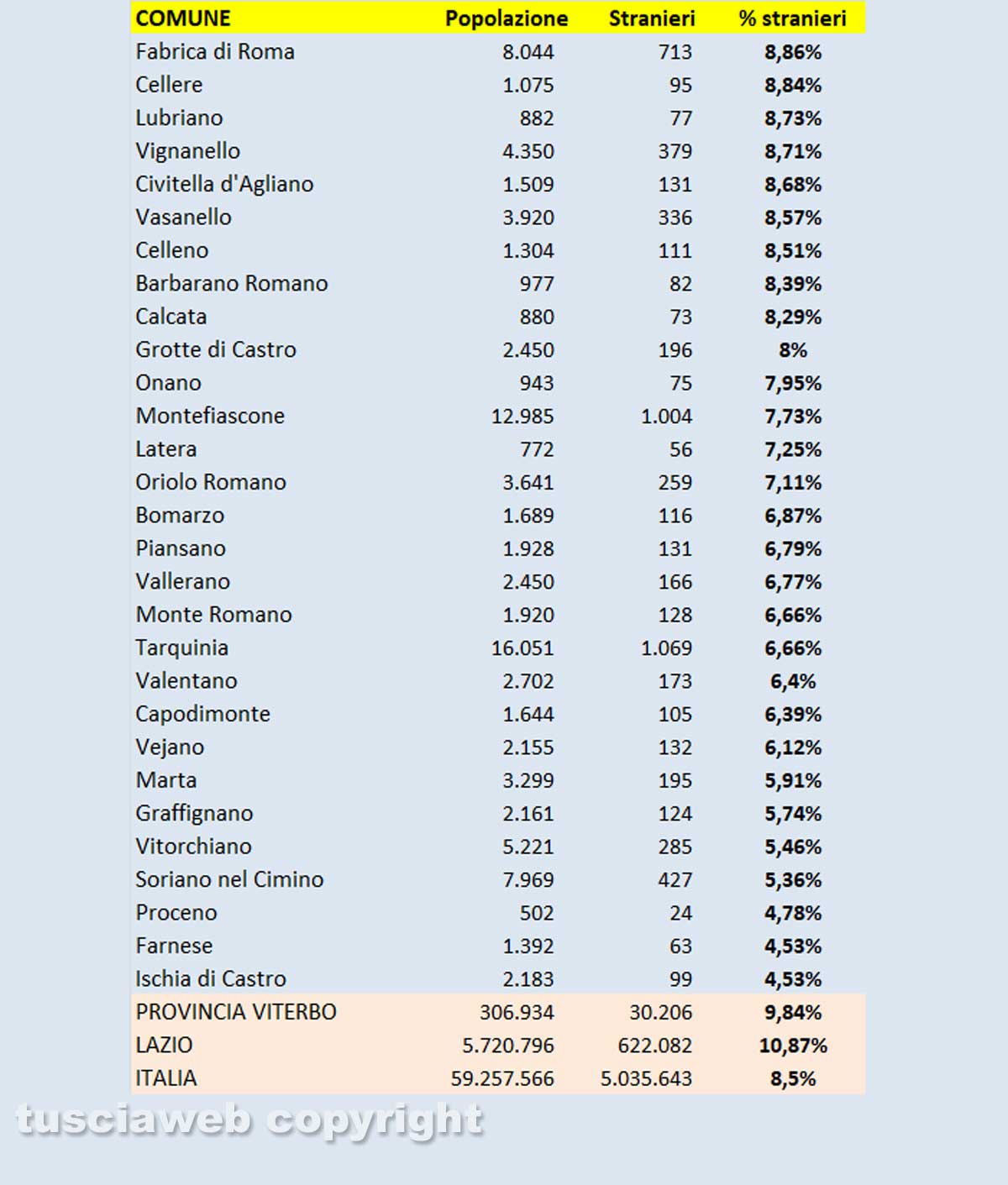 Per quanto riguarda i centri più popolosi della Tuscia, Viterbo è al 9,46%, con 6153 abitanti stranieri sul totale di 65mila 050. Civita Castellana è al 13,24% e Vetralla al 10,47%.