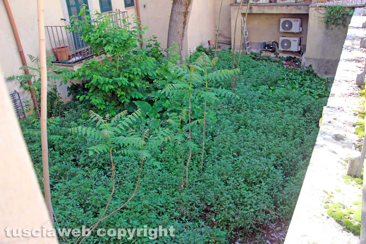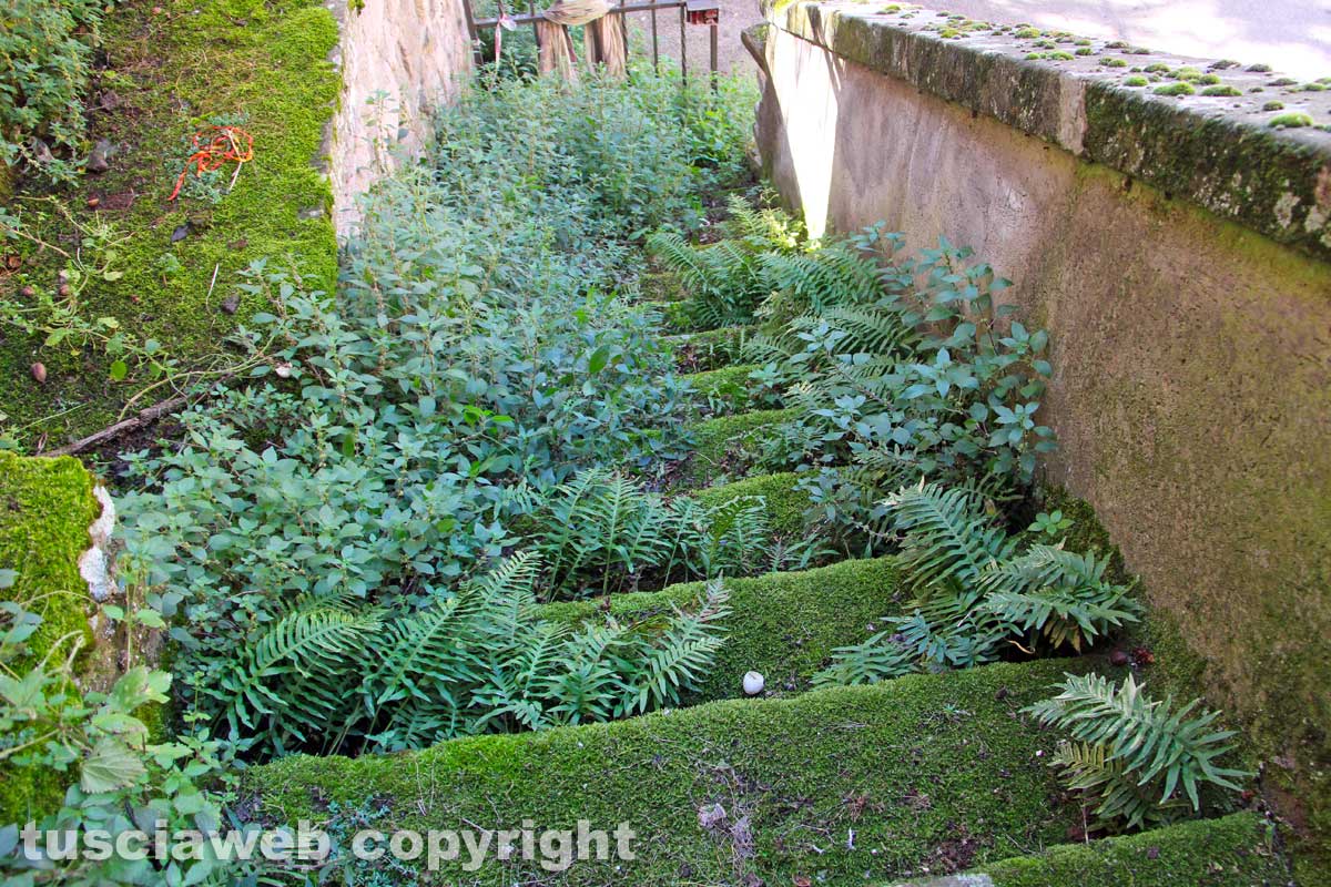 Dentro Porta della Verità gli ultimi due casi della giornata. Il giardino Chiara Lubich e una casa in piazza Dante. Quest’ultima, un’abitazione diroccata e abbandonata a sé stessa da anni. Dentro, ci stanno solo i piccioni. Nel giardino, la vegetazione è di tutti i tipi. E lungo le scale, col muretto in parte crollato, ci sono pure le felci. Come nel bosco. Solo che Viterbo è una città.