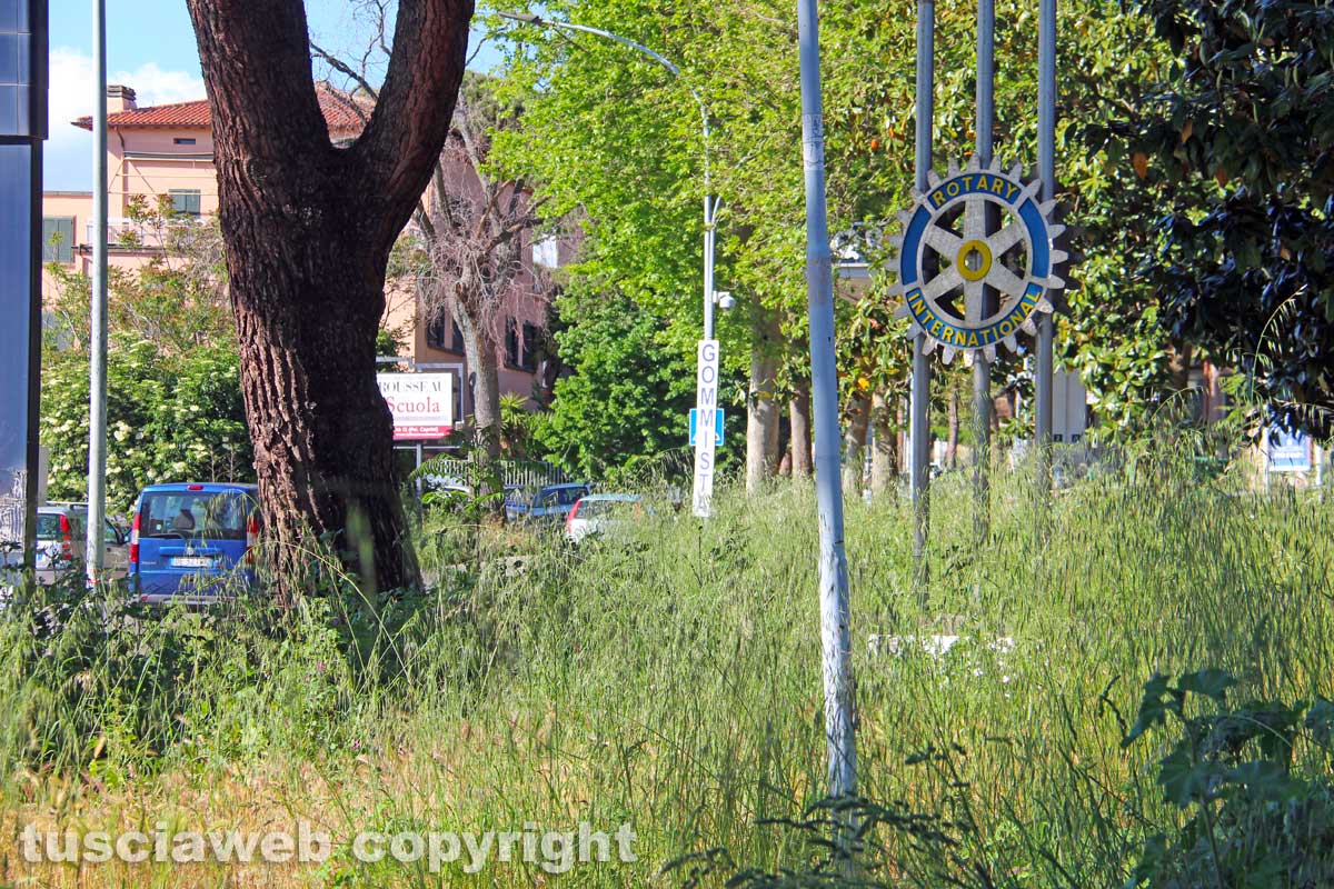 Dalle parti della stazione di Porta Romana, il piccolo parco a valle, dedicato ai 50 anni del Rotary a Viterbo, “c’ha i furasacchi più alti d’un cristiano”. Come faceva notare un passante. L’area, con l’erbaccia dirimpetto al palazzo di vetro di fronte è inaccessibile e soprattutto infrequentabile. Praticamente buttata via. Sommersa dalla vegetazione e con il monumento del Rotary lasciato lì ad arrugginirsi.