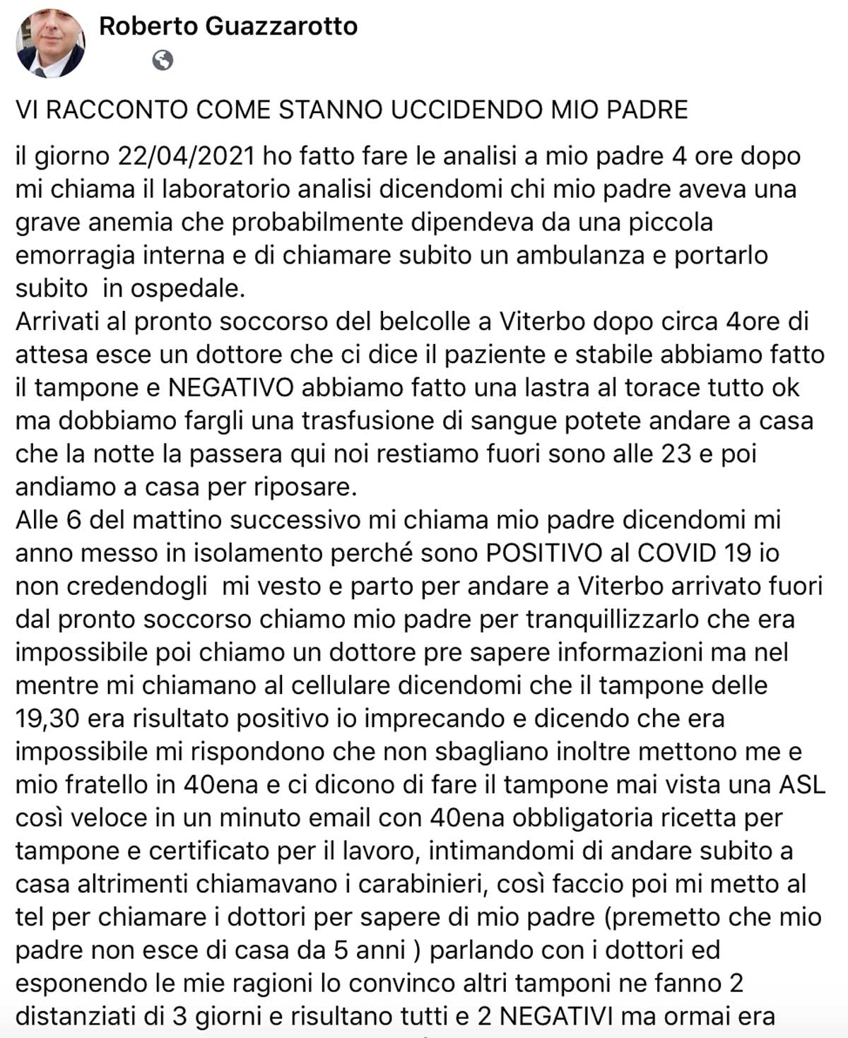 Viterbo – Riceviamo e pubblichiamo il racconto di Roberto Guazzarotto, condiviso anche sui social, sulla vicenda che ha riguardato il padre Filippo, positivo al Covid.