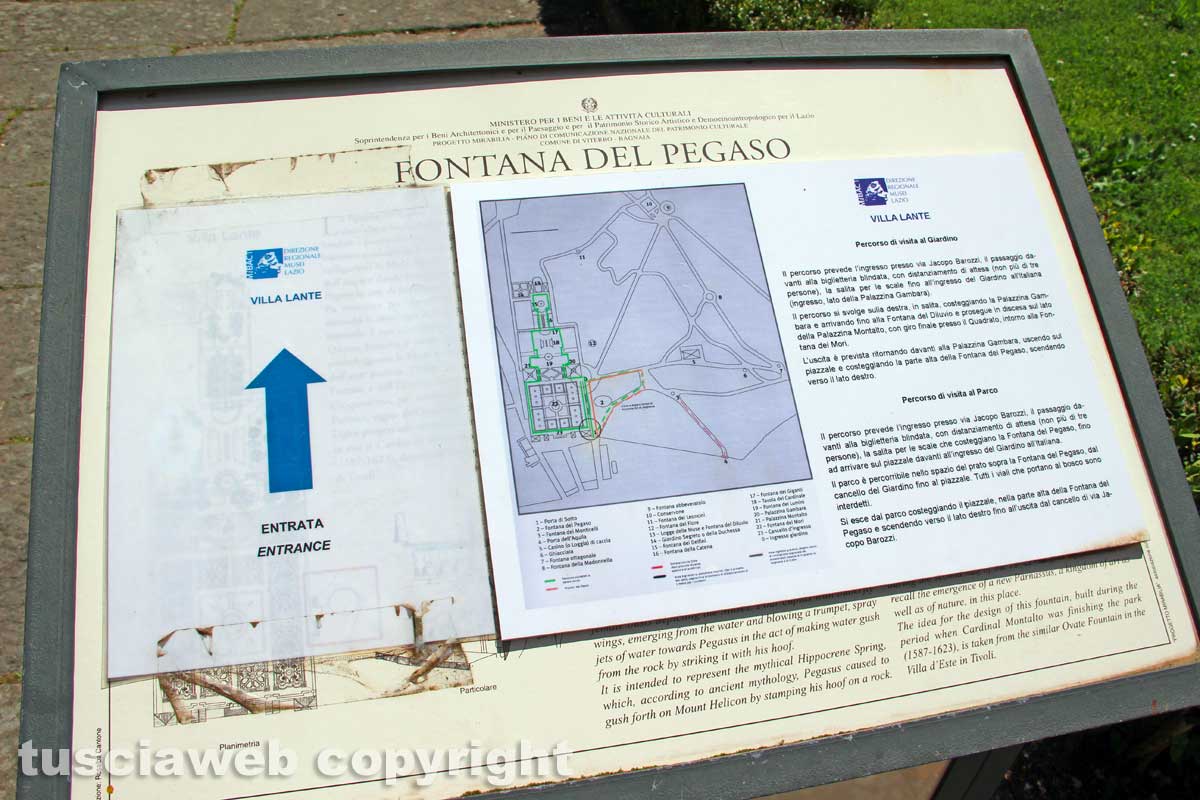 Villa Lante, dunque. Tutto bello. Ma solo all’ingresso, con i custodi che appena ti vedono ti ricordano che devi fare il biglietto. A pagamento per avere accesso alla Villa. Gratis, invece, per entrare al parco. Fatto qualche passo, prima di salire per le scale, la prima bruttura: il pannello che dovrebbe raccontare a viterbesi e turisti la Fontana del Pegaso sottostante, messa anch’essa maluccio. Per l’acqua tutt’altro che limpida. Il panello è adesso coperto dai percorsi di visita. Così, e appiccicato sopra alle bene e meglio.