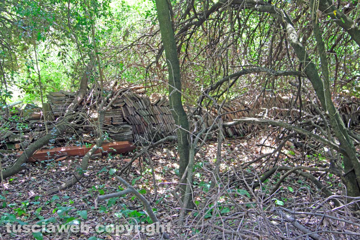 A lati del sentiero, fin dove è possibile arrivare, le cose che si spera i turisti non notino mai sono, nell’ordine: 1) una discarichetta con tanto di, almeno sembrano, mattoncini in cotto, plastica e altra roba buttata là alla rinfusa; 2) elementi appartenenti probabilmente alla villa gettati anch’essi come meglio capita e sommersi da erba e rami secchi; 3) un parcheggio per automobili, sicuramente (?) regolare, perché a un certo punto, sdraiati a terra come la scultura di un sarcofago, si vedono un paio di segnali che lo indicano. Tuttavia affatto bello da vedere, così come una macchina che, per metterla all’ombra, sembrerebbe essersi addentrata un po’ troppo; infine, 4, una scatola con dei fili a cielo aperto.