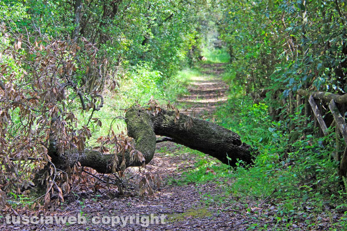 Lungo il sentiero, che un tempo girava attorno a tutta la villa, per quel poco che ancora si vede, si vede veramente il peggio. L’erba è altissima, gli alberi sembrano in condizioni non ottimali e qualcuno ostacola anche il passaggio, perché è caduto in terra. Come una specie di trappola da film horror. The walking dead.
