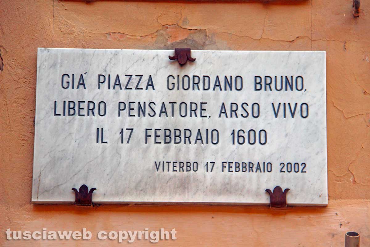 Tant’è che ancora in tempi recentissimi c’era chi ricordava, sotto all’epigrafe dedicata a Bruno, il significato di quel rogo. Il 17 febbraio del 1600. Sacrificio che sta alla base del sistema di valori che ha poi caratterizzato lo stato unitario, e successivamente anche democratico, italiano. Memoria e testimonianza cui l’associazione nazionale carabinieri ha aggiunto altri due pezzi, accrescendo ulteriormente il significato simbolico di un luogo che, se sommiamo soltanto Palazzo Gentili, la chiesa ortodossa, casa Poscia più avanti, fra l’altro, pare anche l’ultima abitazione di una famiglia ebrea viterbese deportata dai nazisti durante la seconda guerra mondiale, e la sede stessa dell’associazione carabinieri, vale veramente d’essere visitata.