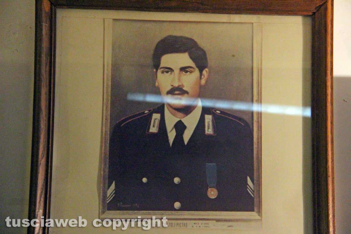 All’interno c’è invece la foto del Generale Carlo Alberto Dalla Chiesa che trasformò la lotta al terrorismo in una guerra e lo sconfisse. Per poi essere ucciso 100 giorni dopo a Palermo con l’autista e la moglie Emanuela Setti Carraro, il 3 settembre 1982. L’anno dei mondiali vinti e della caduta delle Brigate Rosse. Con i carabinieri, assieme alle altre forze dell’ordine, al fronte per oltre 15 anni. Con morti, stragi, vittime e scontri che hanno caratterizzato il paese per tutto il decennio dei ’70. Toccando anche Viterbo con la morte di Cuzzoli, Cortellessa e Rubuano e altre vicende legate al terrorismo e qualche anno più tardi anche a Gladio.