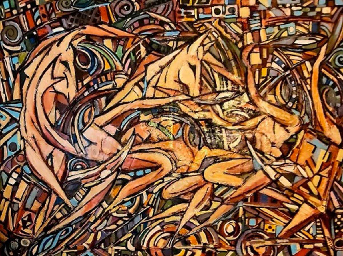 Chiudono il percorso della mostra le dieci grandi tele di Angelo Paccosi, pittore viterbese autodidatta. I suoi grandi quadri, realizzati con stucco ed acrilico, ricchi di incisioni forti e decise, rappresentano paesaggi e figure dai colori densi, contorni incisi e linee nere di grande intensità emotiva, visioni animate “intriganti ed intrigate” cariche di movimento, spazio e materia che coinvolgono l’osservatore in un suggestivo vibrare di corpi che emana una fortissima carica di energia.