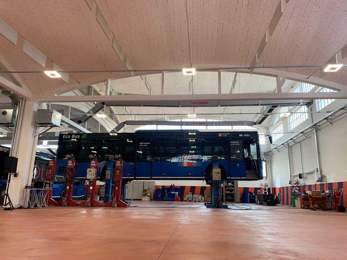 Gli interventi di ristrutturazione hanno riguardato anche il rifacimento del piazzale esterno e delle recinzioni, dell’impianto di depurazione delle acque piovane e di quelle di scarico provenienti dell’arco di lavaggio dei bus, oltre alla realizzazione di un nuovo impianto di illuminazione a led in ottica di risparmio energetico. All’interno del grande edificio che fino ad oggi ha ospitato soltanto gli uffici, tutti gli ambienti (sala d’attesa per i clienti, locali tecnici, servizi igienici e spogliatoi) sono stati trasformati con particolare attenzione al comfort e alla qualità di materiali e arredi.