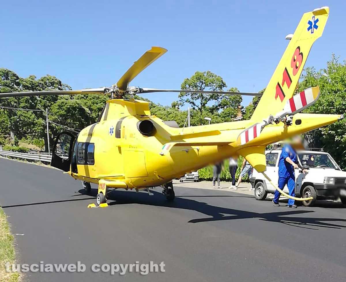 A bordo un uomo di 80 anni di Canepina che sarebbe molto grave ed è stato soccorso dal 118 con l’elisoccorso.