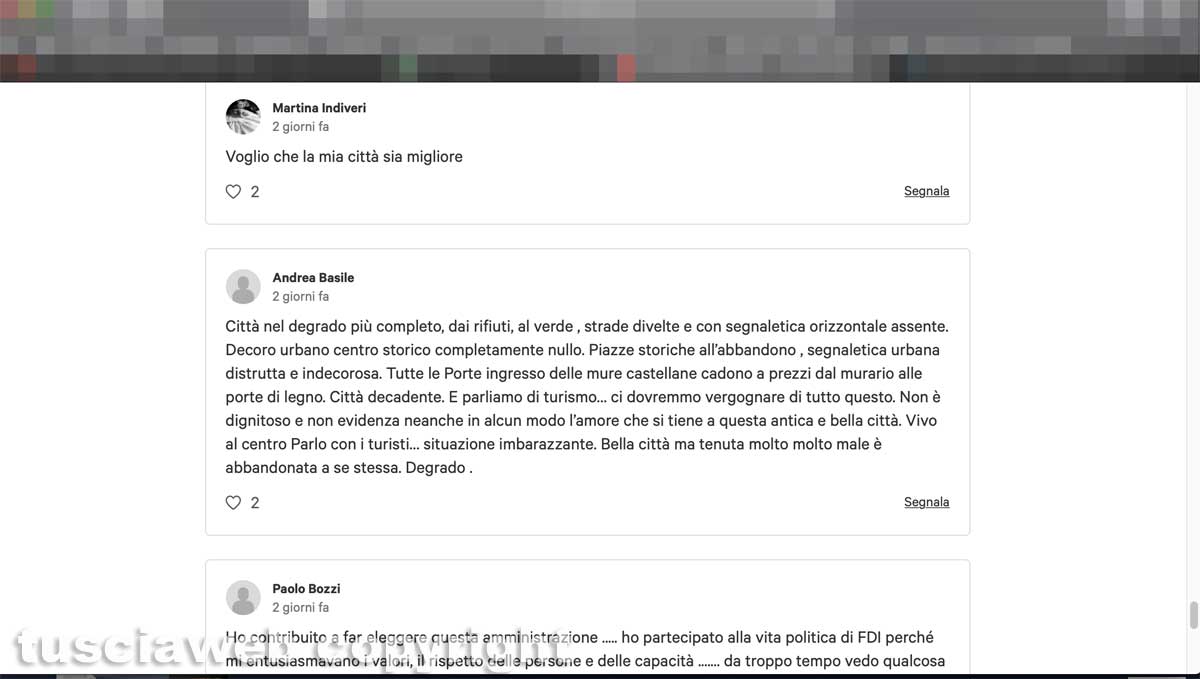 “Basta girare per la città, scandalosa senza motivo”, dice Daniele Puglisi. “La città è sporca e degradata, le frazioni abbandonate”, Giovangiorgio Afan de Rivera Costaguti. “La situazione in città è insostenibile, urge un cambio di rotta! La situazione delle strade, del verde pubblico, dei beni comuni in generale è estremamente grave e temo ci vorranno anni per recuperarla”, Stefania Moscatelli.