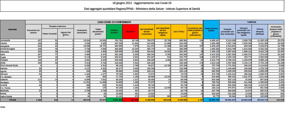 Coronavirus – Il bollettino del ministero della Salute del 18 giugno 2021