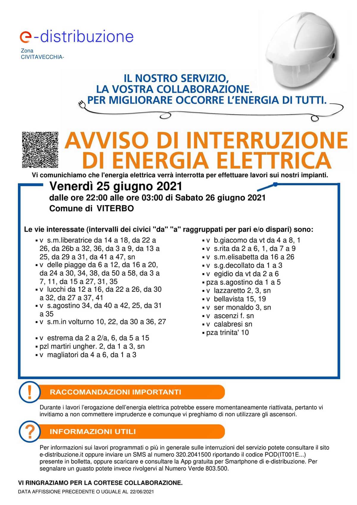 Durante i lavori l’erogazione dell’energia elettrica potrebbe essere momentaneamente riattivata, pertanto vi