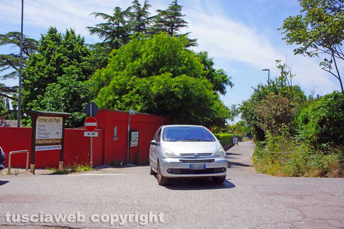 La vegetazione è bella abbondante lungo tutta strada Bagni, al punto che il marciapiedi che porta a Viterbo ne è completamente sommerso. Mentre le macchine che vengono giù dalla Tuscanese, quando arrivano all’incrocio delle terme lo imboccano invadendo sistematicamente la parte riservata allo Stop delle automobili che si lasciano alle spalle la città.