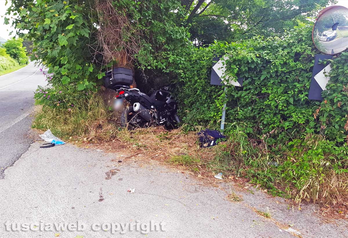 Brutto incidente nel pomeriggio a Viterbo. Per cause ancora d’accertare, poco prima delle 16 e 30 una moto è finita fuori strada e si è schiantata contro un albero. L’incidente è avvenuto in strada Querciaiolo, nei pressi dell’incrocio con strada Ortana.