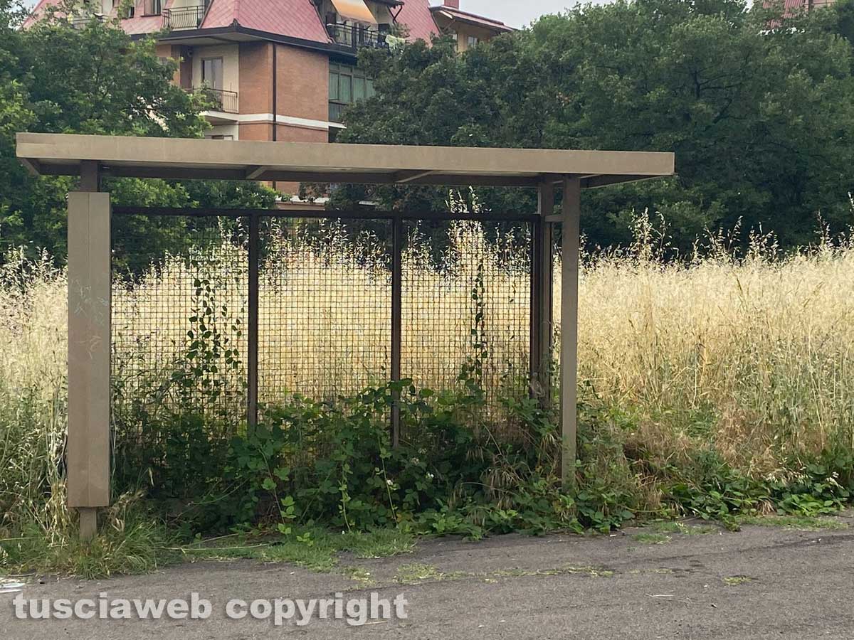 Viterbo – Riceviamo e pubblichiamo – Queste sono le foto di una selvaggia via della Mazzetta, potete ammirare i rigogliosi marciapiedi, si sotto la fratta ci sono, l’utilissima pensilina dell’autobus, non serve dato che l’autobus non passa e a breve verrà inglobata nelle sterpaglie, non può mancare la transenna che sta lì da anni.