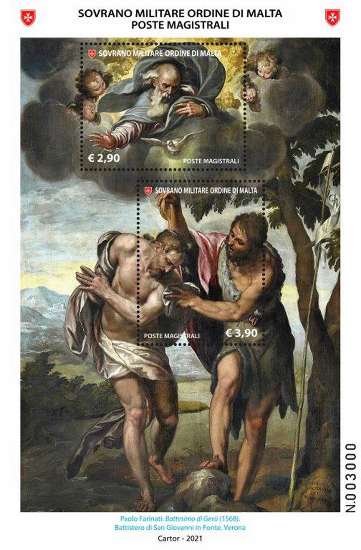La terza serie, infine, dedicata a San Giovanni Battista, Patrono del Sovrano Militare Ordine di Malta, si compone di due valori da Euro 2,90 e 3,90 raccolti in foglietto, illustrati dal “Battesimo di Gesù” di Paolo Farinati (1568), conservato a Verona nel Battistero di San Giovanni in Fonte.
