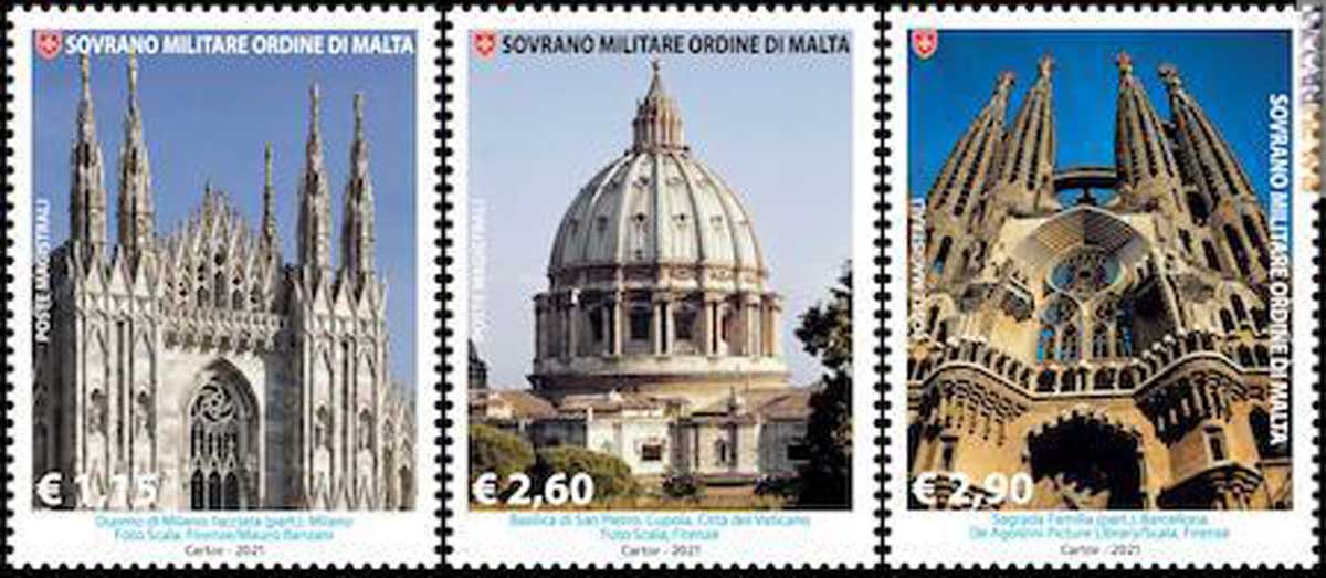 I tre francobolli raffigurano: – €. 1,15 Duomo di Milano: facciata. – €. 2,60 Basilica di San Pietro: Cupola. – €. 2,90 Sagrada Familia di Barcellona.
