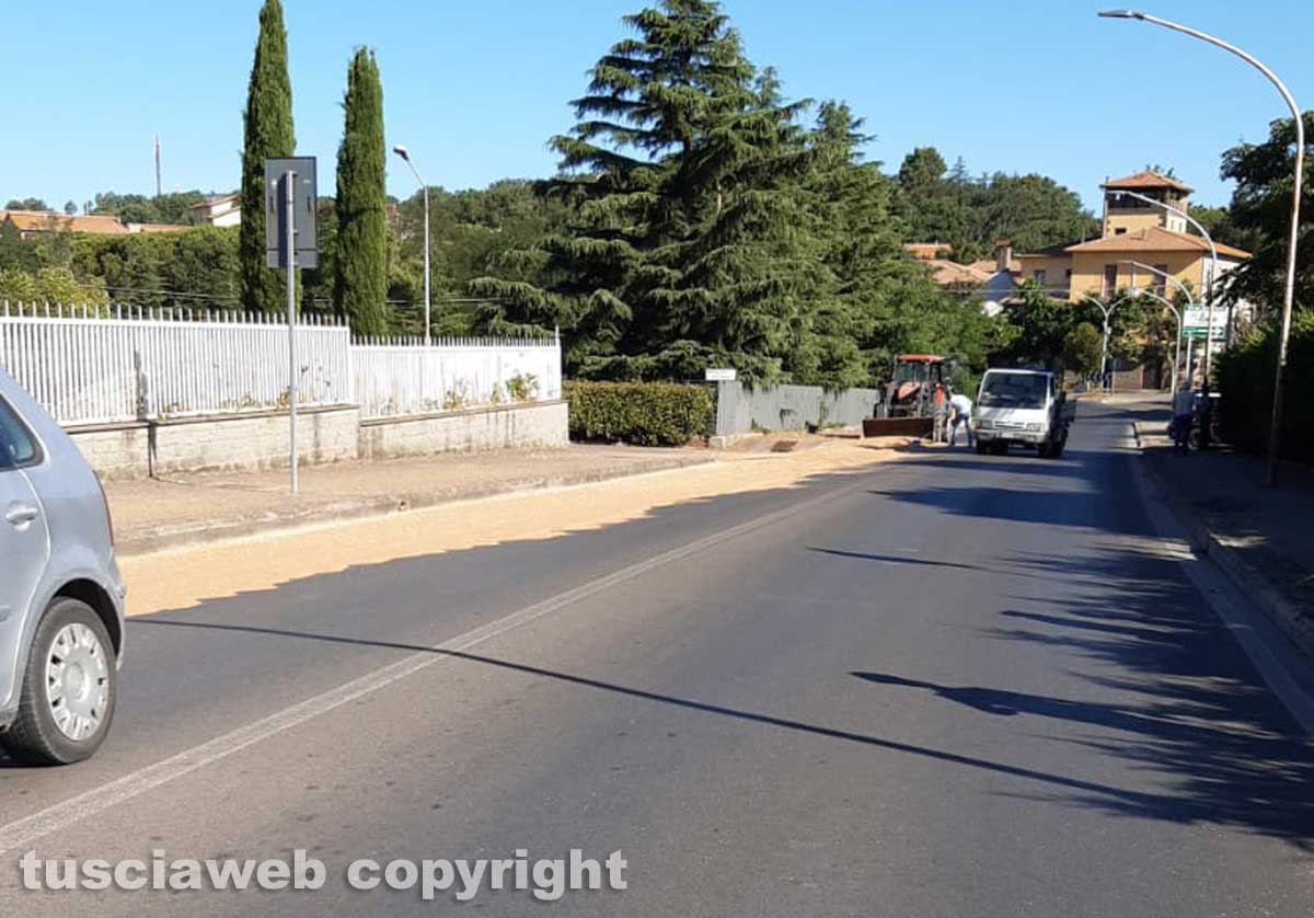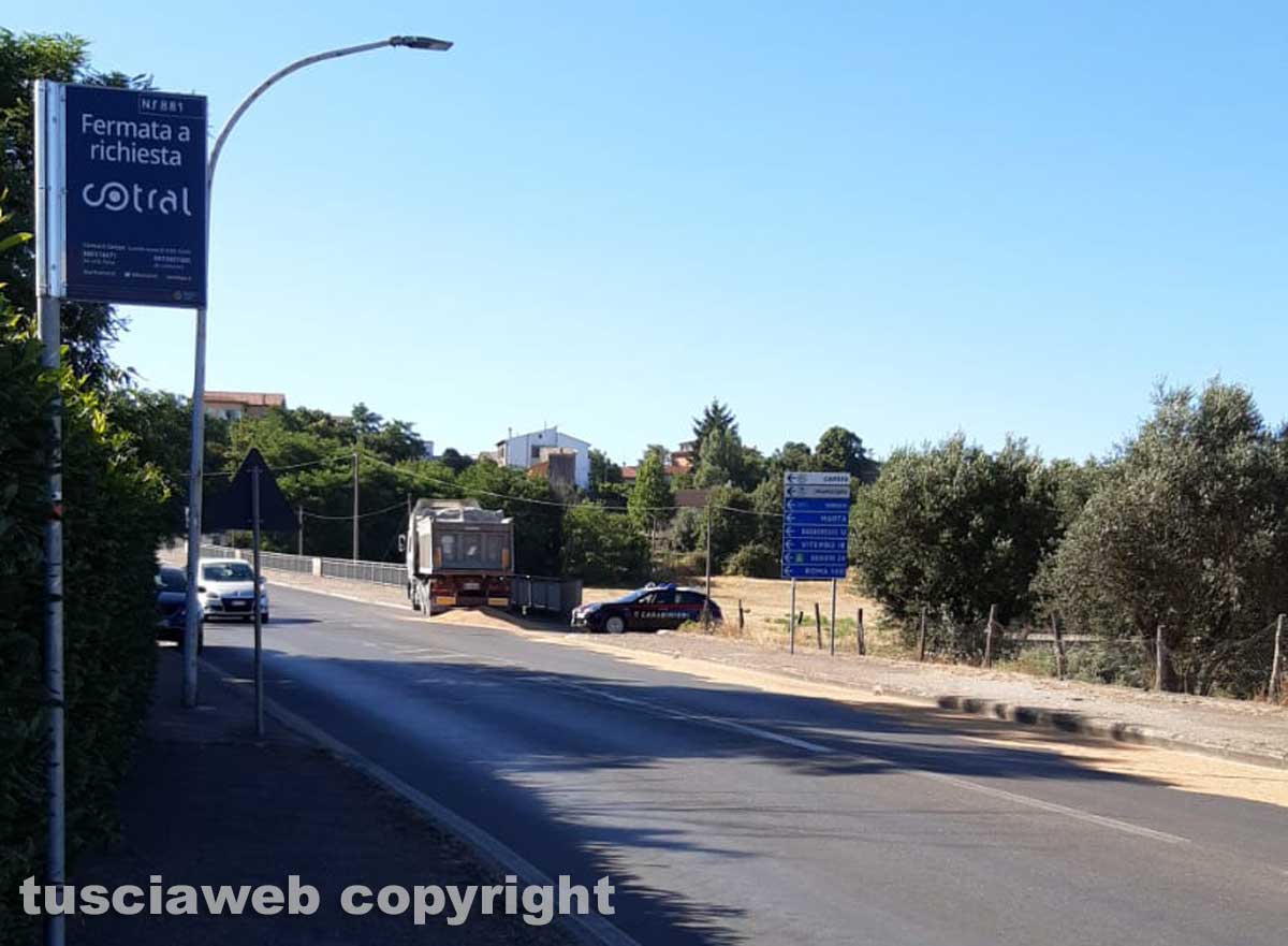 Montefiascone – Camion perde il carico di grano per duecento metri sulla Cassia nord. È accaduto questo mattina intorno alle 8,30 sulla Cassia a Montefiascone vicino alla frazione Coste nei pressi dell’incrocio con via Cardinal Salotti.