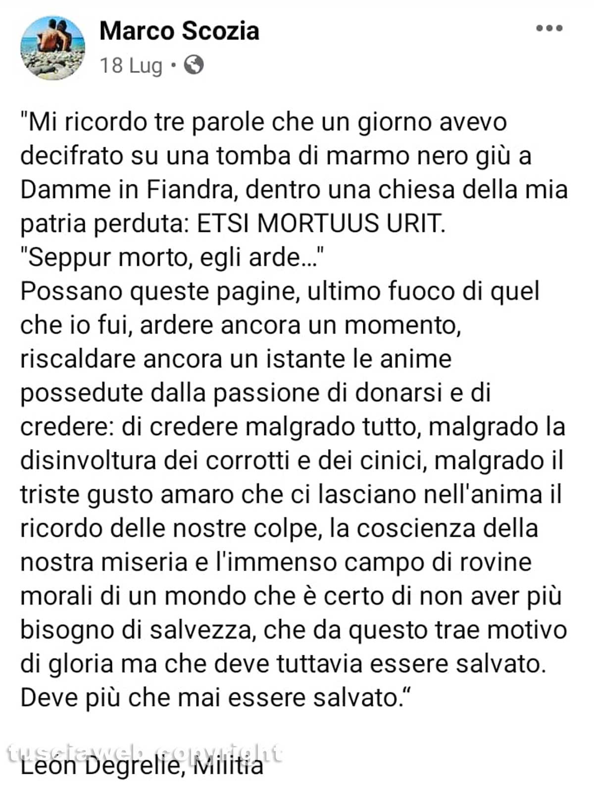 Riceviamo e pubblichiamo – Nei giorni scorsi il consigliere comunale di Civita Castellana Marco Rossi ha pubblicato un post sul suo profilo Facebook in cui riporta un piccolo stralcio del libro “Militia”, saggio storico-politico di Léon Degrelle.
