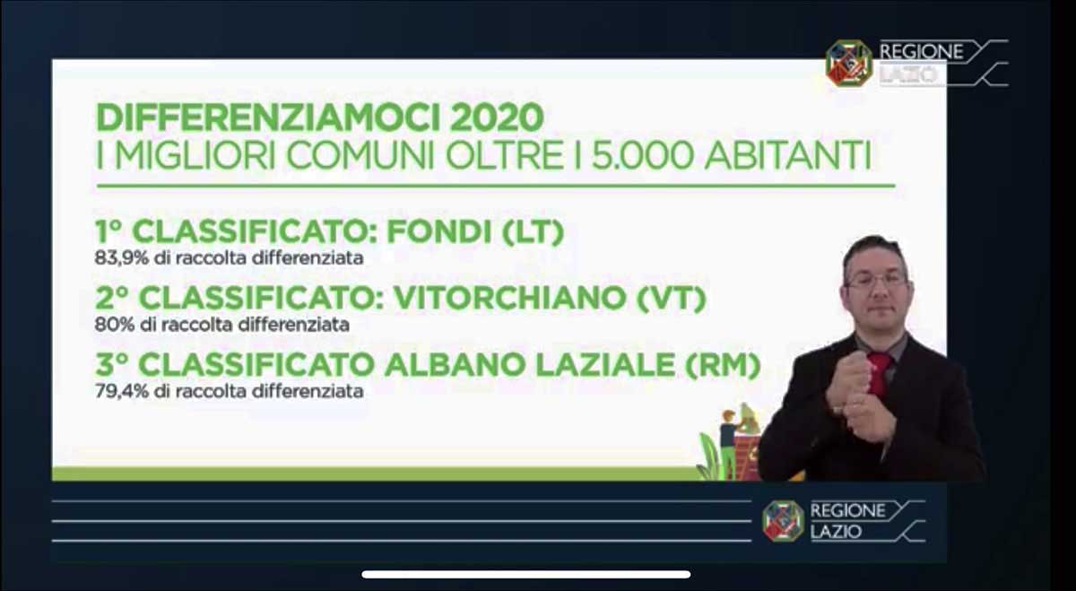 Il 22 luglio a Roma, nell’evento “Lazio Green. Comuni puliti 2020” svoltosi in presenza e trasmesso dalla Regione in diretta sui suoi canali social, Vitorchiano è risultato secondo nel Lazio, oltre che primo nella provincia di Viterbo, nella categoria dei comuni con popolazione tra 5 e 15mila abitanti per l’impegno e i traguardi conseguiti nella corretta gestione del ciclo dei rifiuti urbani.