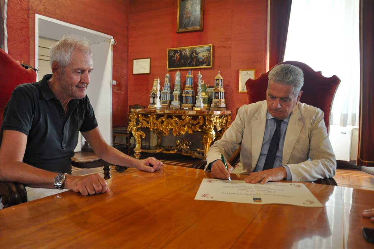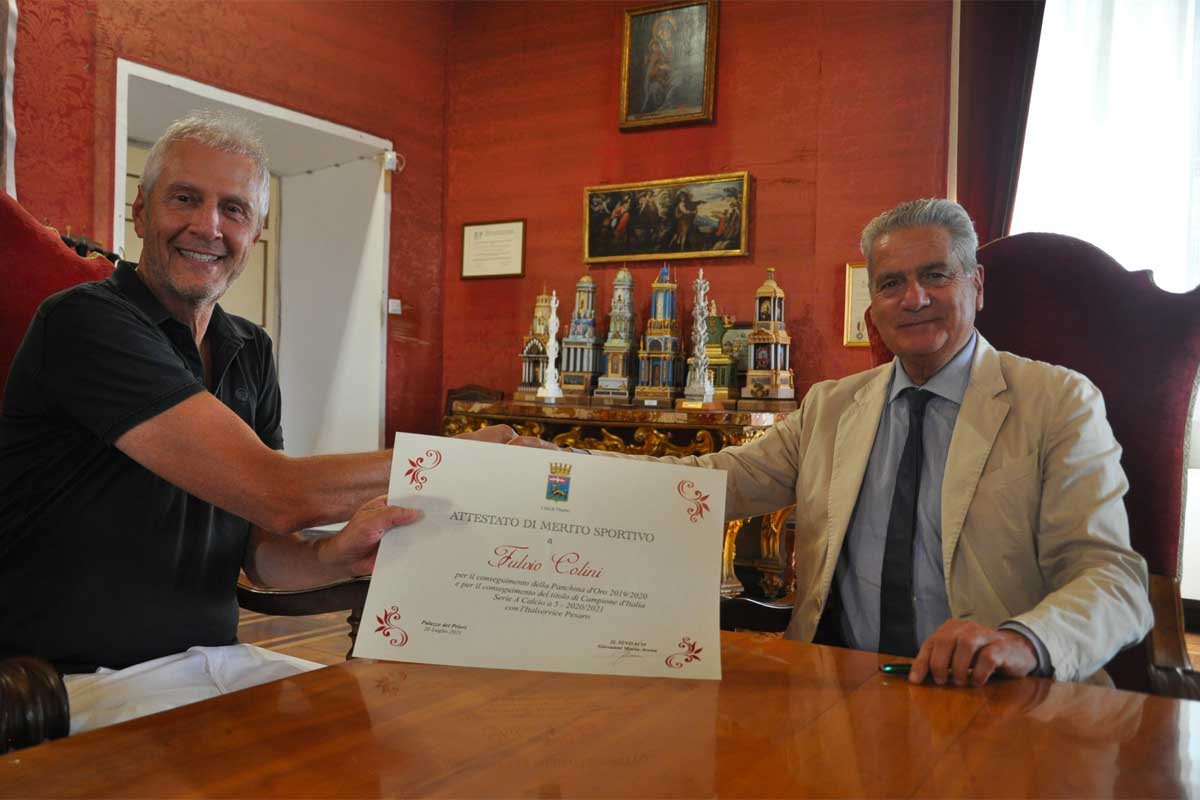 “Fulvio Colini oltre a essere un grande allenatore – ha sottolineato il sindaco Arena durante la cerimonia – è da sempre un grande sportivo. Un passato da tennista e una lunga serie di vittorie con le squadre che ha allenato negli anni. Per due anni di seguito panchina d’oro e un prestigioso titolo di campione d’Italia in serie A. Un grande in bocca al lupo per il prossimo campionato“.