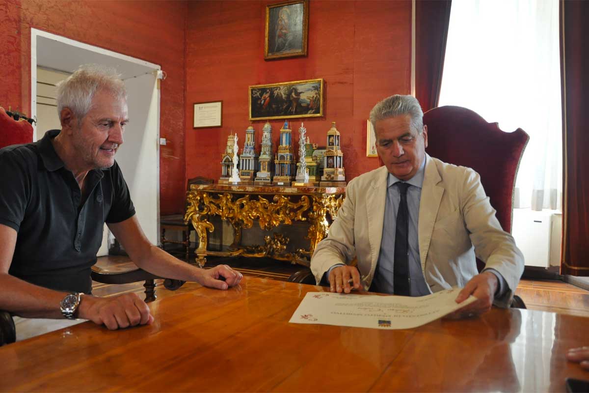 Viterbo – Riceviamo e pubblichiamo – Il sindaco di Viterbo Giovanni Maria Arena ha consegnato nel pomeriggio di ieri un attestato di merito sportivo a mister Fulvio Colini. Alla cerimonia, svoltasi nella sala rossa di palazzo dei Priori, sono intervenuti anche l’assessore allo sport Marco De Carolis e il consigliere comunale delegato ai rapporti con le associazioni e le società sportive Matteo Achilli.