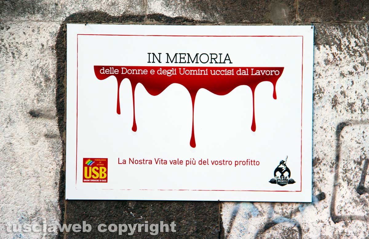 L’altro giorno, un’epigrafe dedicata. “In memoria – sta scritto sopra – delle donne e degli uomini uccisi dal lavoro. La nostra vita vale più del vostro profitto”. In piazza della Repubblica, a Viterbo. Di fronte al monumento dei facchini, angolo via Marconi. L’ha messa l’Usb, Unione sindacale di base. Con una corona d’alloro. Come fa ogni anno, da quattro a questa parte. Prima a via caduti sul lavoro, davanti allo stadio Rocchi, lungo via della palazzina. Poi a piazza della Repubblica, dove più di 10 anni fa volò giù da un palazzo un lavoratore di 29 anni. Quest’anno, nella stessa piazza, l’Usb ha voluto lasciare il segno, di quella e di tantissime altre morti.