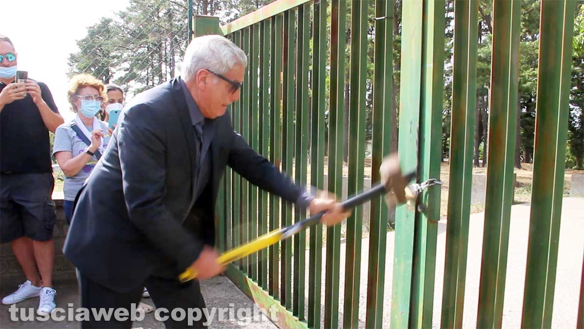 Viterbo – Aperto sì, ma a colpi di mazzetta. Poi, a un certo punto, per caso, è arrivata la chiave del cancello. Anche perché il lucchetto stava resistendo a tutto. “Pija la mazza – ha detto a un certo punto il sindaco Giovanni Arena -, sfascio tutto!”. Inaugurazione del parco Norma Cossetto a San Martino, comune di Viterbo. Poco fa.