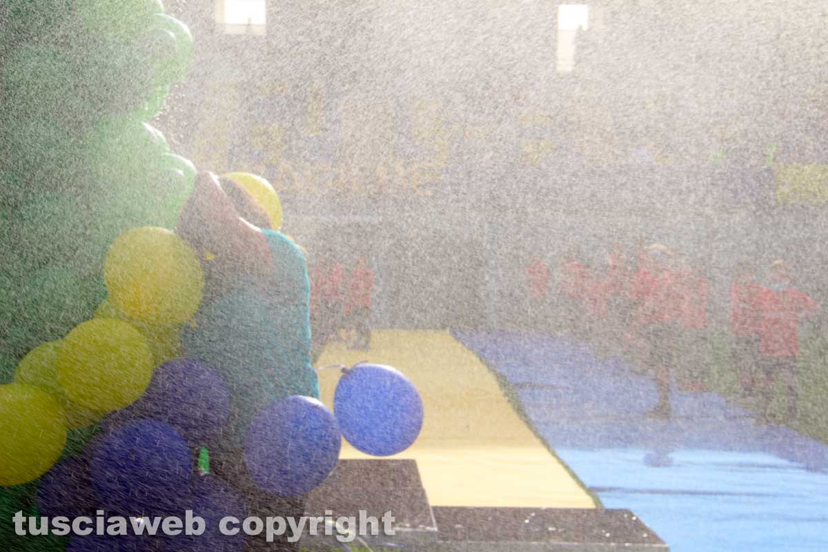 Infine lo stadio. Da Wembley al Rocchi. Stessa emozione, se non più forte. “Col cuore che batte più forte qui, davanti a mille viterbesi – ha sottolineato il giocatore – piuttosto che davanti a 70 mila persone”. Ad accoglierlo due file di bambini, a lato di un tappeto giallo e blu che portava a un palco a centrocampo, con alle spalle pratogiardino Lucio Battisti e il tricolore formato da decine e decine di palloncini bianco, rosso, verde e i colori di Viterbo, lanciati poi verso il cielo a fine evento. All’inizio, però, un piccolo inconveniente. Piacevole, per il caldo umido e asfissiante. A un certo punto è stato acceso un irrigatore e l’acqua alla fine ha puntato dritta verso il palco e i palloncini con l’elio, rischiando di ammosciarli uno dopo l’altro. A salvarli c’ha pensato Arianna Perugini di “Festeggiamo” che ha curato l’allestimento. Ci si è buttata letteralmente sopra. Proteggendoli.