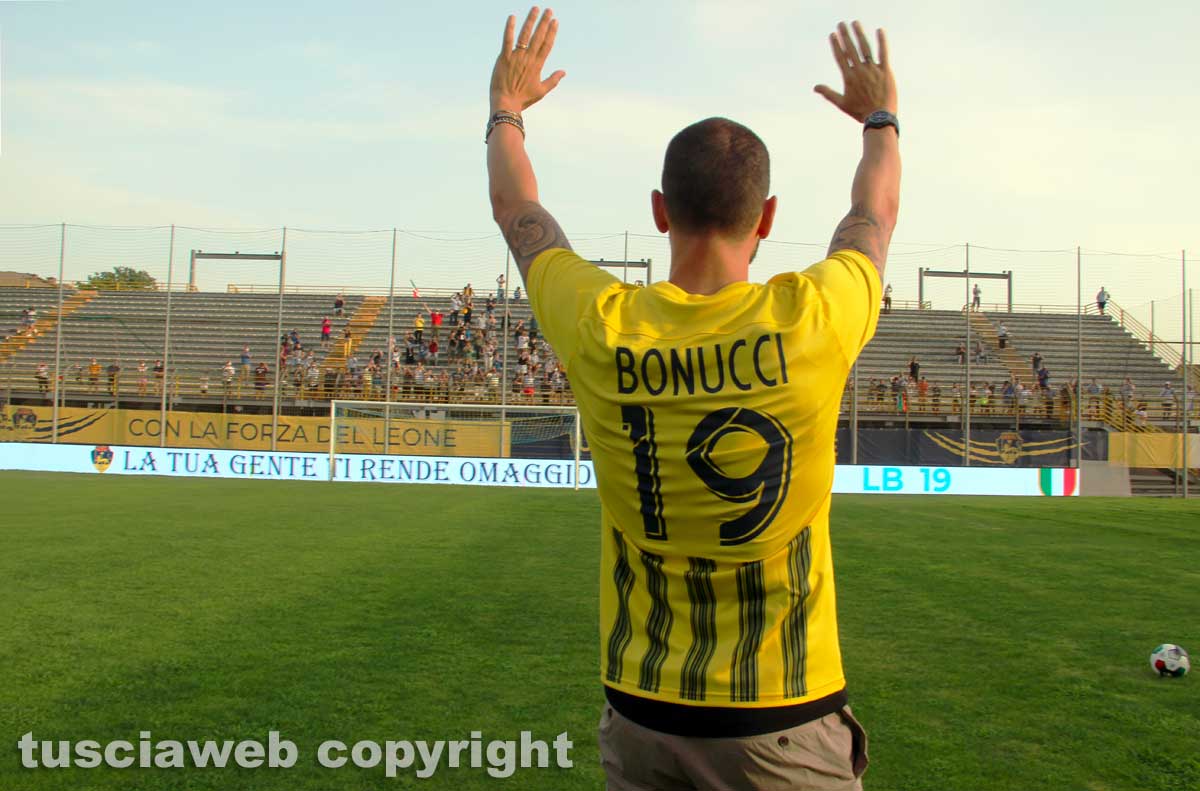 Con Bonucci, a centrocampo, c’erano anche il fratello Riccardo, il sindaco Giovanni Arena, l’assessore comunale alla cultura e al turismo, Marco De Carolis e il presidente della viterbese Marco Romano. A moderare il tutto, la giornalista Eleonora Celestini. Il discorso del calciatore, quello del primo cittadino e le domande dell’assessore sul rigore calciato in finale e il trasporto della Macchina di Santa Rosa. Infine regali e riconoscimenti. Dalla tifoseria agli artisti in città fino alla maglia numero 19 della Viterbese.