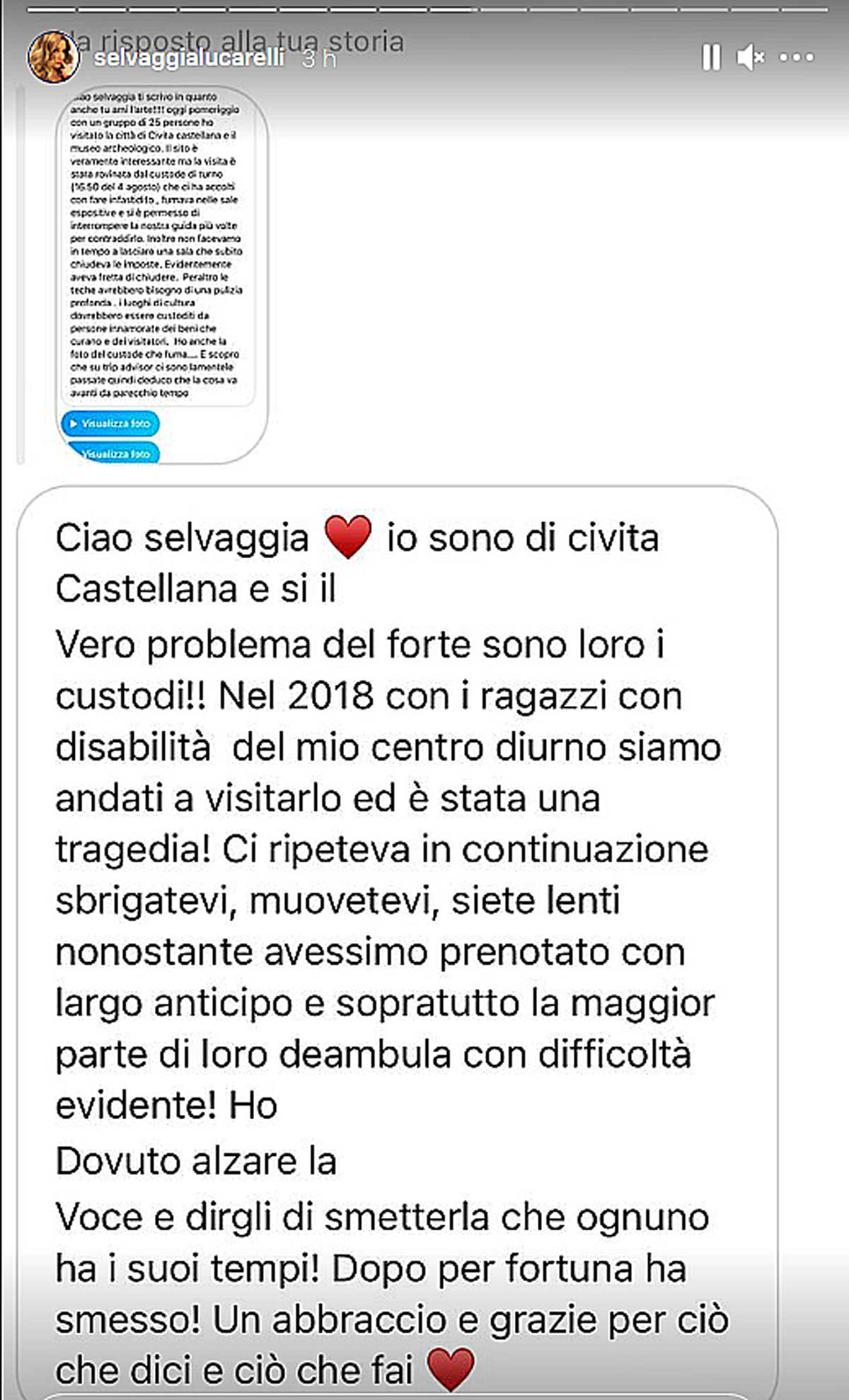 In risposta al commento ne è arrivato un altro, che Lucarelli ha sempre pubblicato come storia. “Io sono di Civita Castellana – scrive un altro follower della giornalista – il vero problema del Forte sono loro, i custodi.