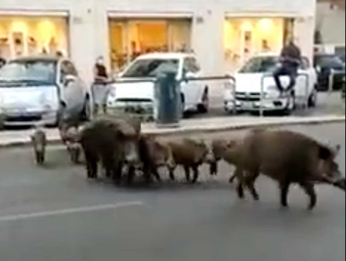 La denuncia arriva sui social da parte del candidato sindaco nella capitale Carlo Calenda, che ha pubblicato su facebook un video in cui una famigliola di 13 cinghiali passeggia in fila indiana tra le vide della città.