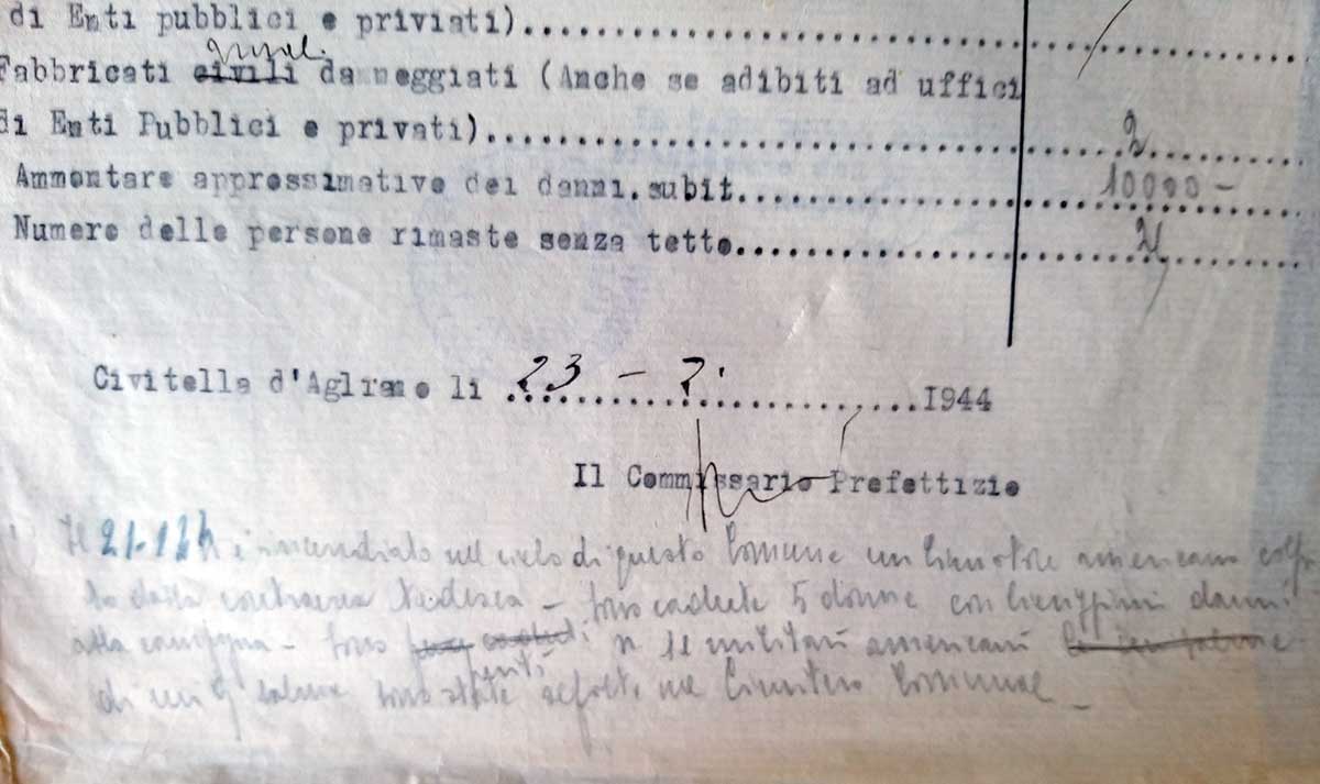 “Dalle ricerche effettuate nell’archivio storico di Civitella d’Agliano – aggiunge Michele Mari – è stato ritrovato un documento in cui vi è scritto: ‘il 21 gennaio 1944 si è incendiato nel cielo di questo comune un bimotore americano colpito dalla contraerea tedesca. Sono stati feriti 12 militari americani di cui 9 salme sono state sepolte nel cimitero comunale’. Il documento conferma quindi la data dell’abbattimento del velivolo anche se il numero degli aviatori rimasti feriti o uccisi è maggiore rispetto al numero dei membri del B-26 in quanto quel giorno vennero abbattuti altri aerei americani nelle vicinanze”.