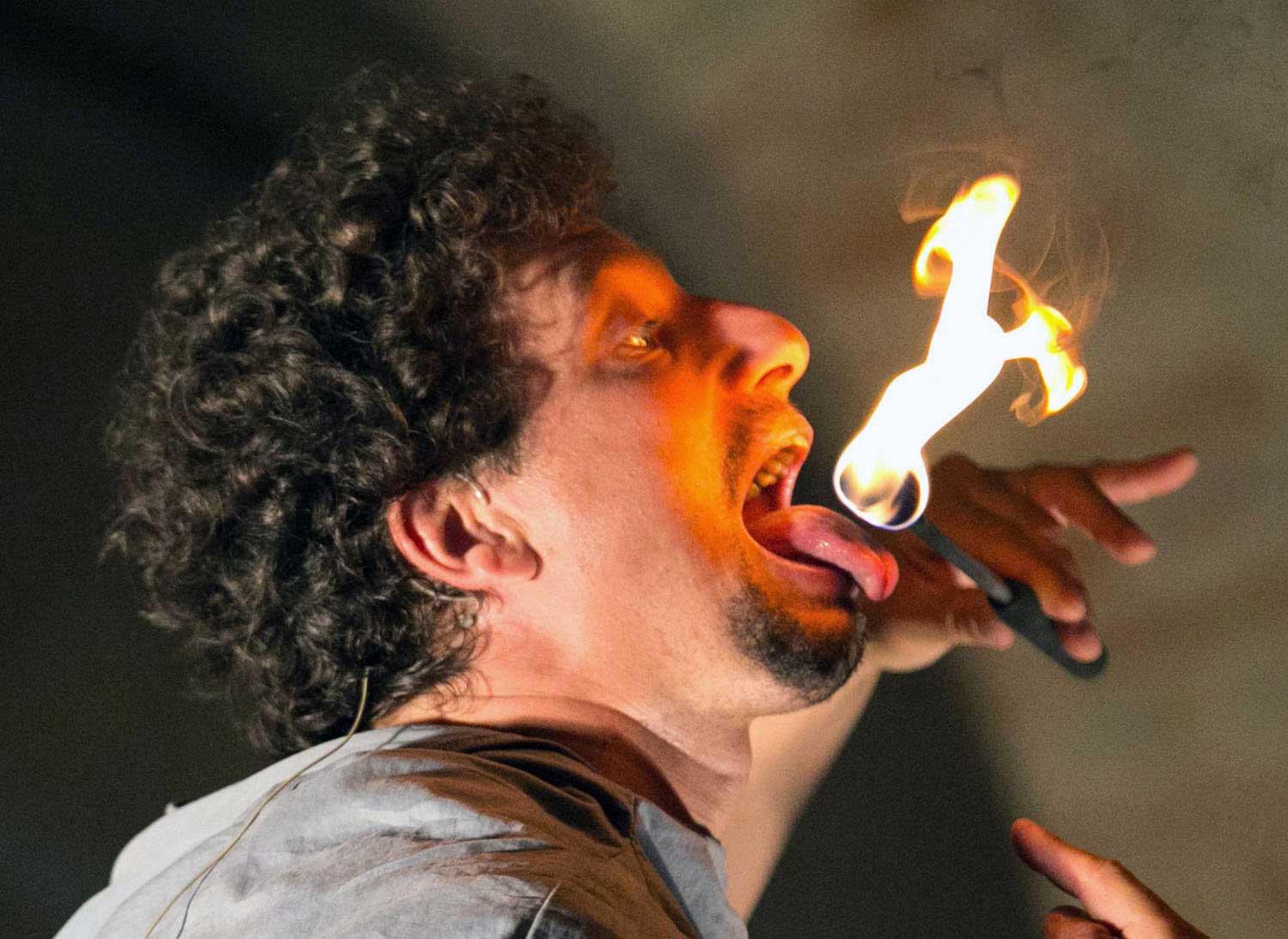 Una performance ironica e sensuale: in una cornice musicale arabeggiante sarà la danza a svilupparsi con l’elemento del fuoco, alternando sulla scena bolas, ventagli e altri effetti pirotecnici.