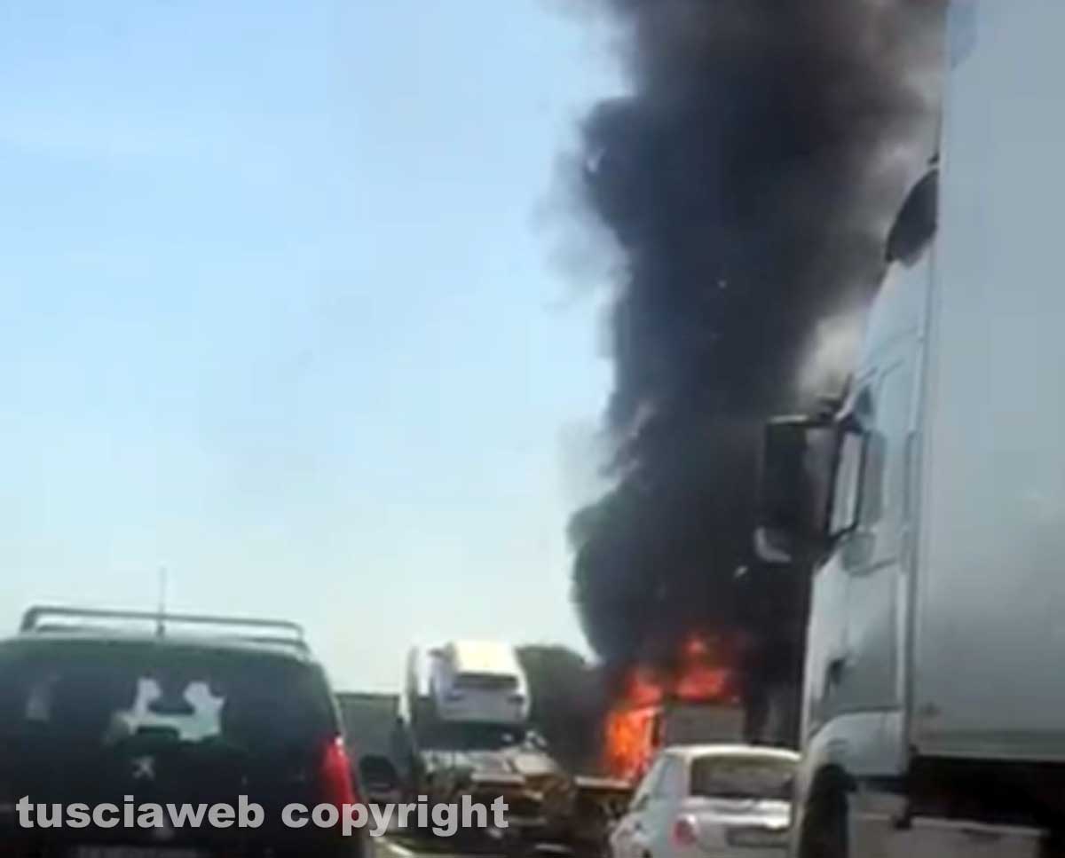 Un camion, infatti, per cause ancora in corso di accertamento, è stato completamente avvolto dalle fiamme e sta ancora bruciando. Dal mezzo si alza una densa colonna di fumo nero che si vede anche a molta distanza.