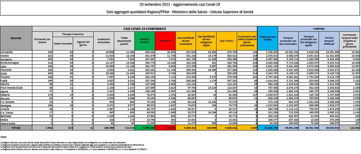 Coronavirus – Il bollettino del Ministero della Salute del 20 settembre 2021