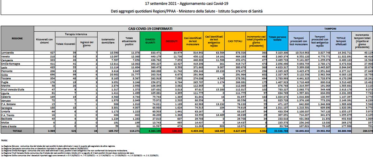Coronavirus – Il bollettino del ministero della Salute del 17 settembre 2021