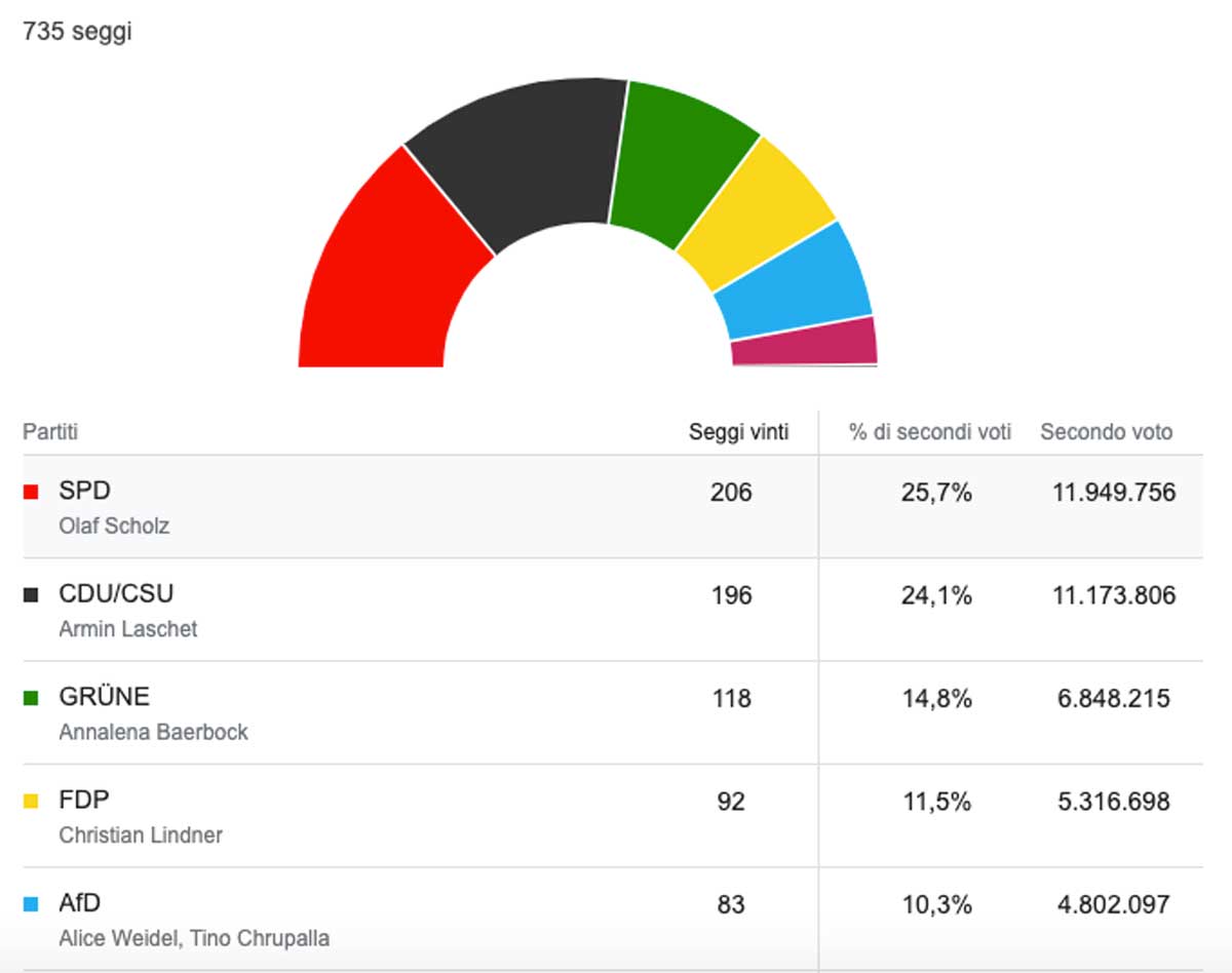 I socialdemocratici risorgono dopo la batosta del 2017 e i conservatori sono in calo di consensi, ma entrambe le formazioni rivendicano la cancelleria e dunque l’incarico di provare a costruire una coalizione. In tutto questo Verdi e liberali della Fdp, rispettivamente terzo e quarto partito, diventano il vero ago della bilancia per capire che volto avrà il prossimo governo.