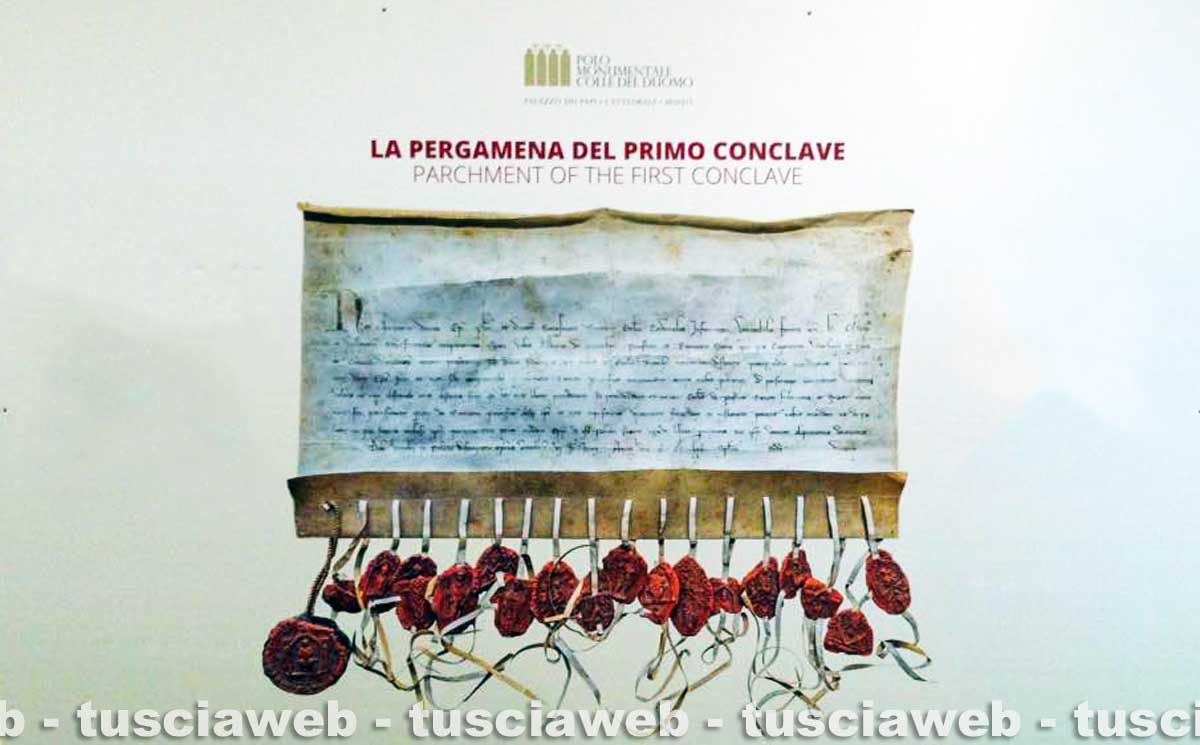 “Con l’apertura del museo dei portici in piazza del comune – spiega De Carolis – una parte sarà dedicata all’esposizione permanente della pergamena del conclave. Verrà predisposta una teca apposita. In questo modo sarà possibile vedere la pergamena originale già a partire dall’inaugurazione del museo, nel giro di qualche settimana. La pergamena, con il parere favorevole della soprintendenza, è stata messa a disposizione dalla biblioteca comunale diretta dal commissario straordinario Paolo Pelliccia”.