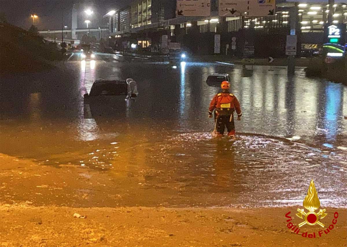 Le operazioni di soccorso effettuate dai vigili del fuoco fluviali a bordo di un gommone per evacuare una trentina di persone bloccate nelle proprie auto dall’acqua, nella zona cargo dello scalo dell’aeroporto.