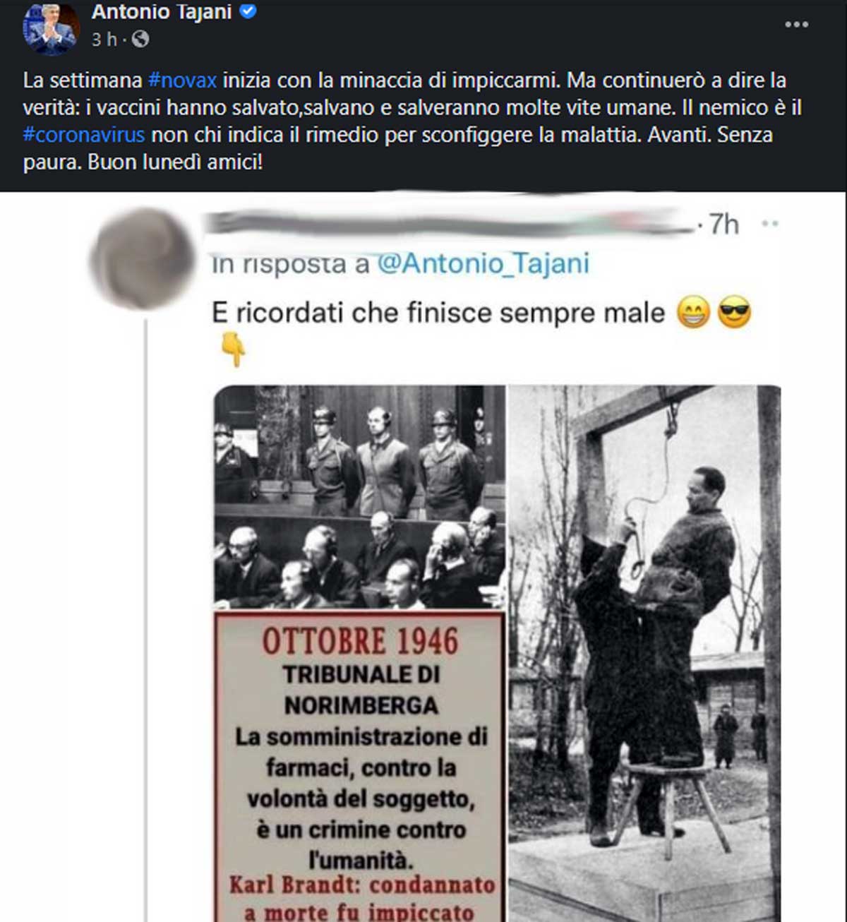 Roma – “La settimana novax inizia con la minaccia di impiccarmi”. Antonio Tajani, vicepresidente e coordinatore nazionale di Forza Italia, riporta sui suoi profili social un post in cui un utente lo paragona al generale nazista Karl Brandt, condannato a morte per impiccagione al processo di Norimberga per crimini contro l’umanità, con il messaggio: “E ricordati che finisce sempre male”.