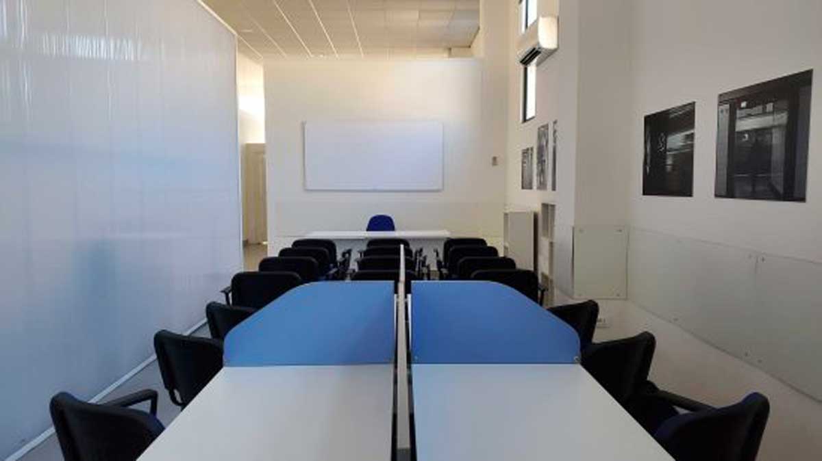 Per chi ha esigenze di formazione o di appuntamenti con più persone, è disponibile la sala corsi. Uno spazio ampio dove possono accedere fino a 20 persone. Spazio fornito di smart tv e proiettore, arredato con poltroncine con ribaltina, accessi separati per poter effettuare entrate e uscite contingentate.