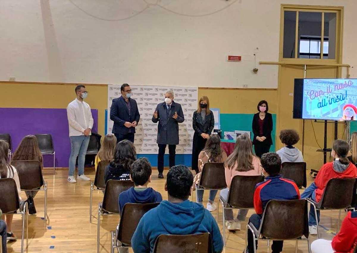 Viterbo – Riceviamo e pubblichiamo – “Con il naso all’insù”, il sindaco Giovanni Maria Arena ha fatto visita questa mattina alla scuola secondaria di primo grado Luigi Fantappiè per congratularsi personalmente con i ragazzi della 2^A, vincitori del primo premio overall della 14esima edizione del concorso nazionale Policultura 2021, organizzato dal Politecnico di Milano.