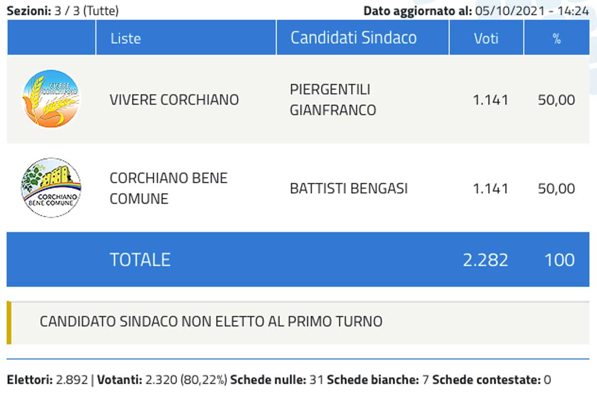 - Adesso è ufficiale, a Corchiano è pareggio e si va al ballottaggio
