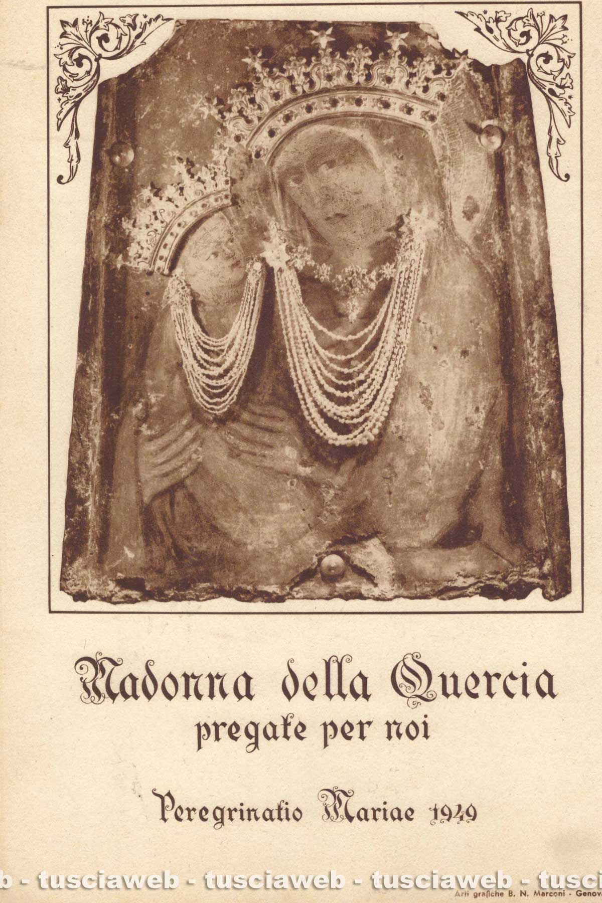 Il 1949 è l’anno della Peregrinatio Mariae. L’immagine miracolosa della Madonna della Quercia viene portata tra le varie parrocchie della diocesi dove è accolta con grande devozione. Va anche nel carcere di Gradi dove è trattenuto Arnaldo Graziosi accusato di aver ucciso la moglie. Verrà graziato da Gronchi. A maggio la Madonna riscuote un grande tripudio ai Cappuccini in coincidenza con le feste del Beato Crispino. Quella scena l’ho davanti agli occhi. In via Monte Pertica una vecchietta affacciata alla finestra, con le lacrime agli occhi grida “Evviva la Madonna della Quercia”.