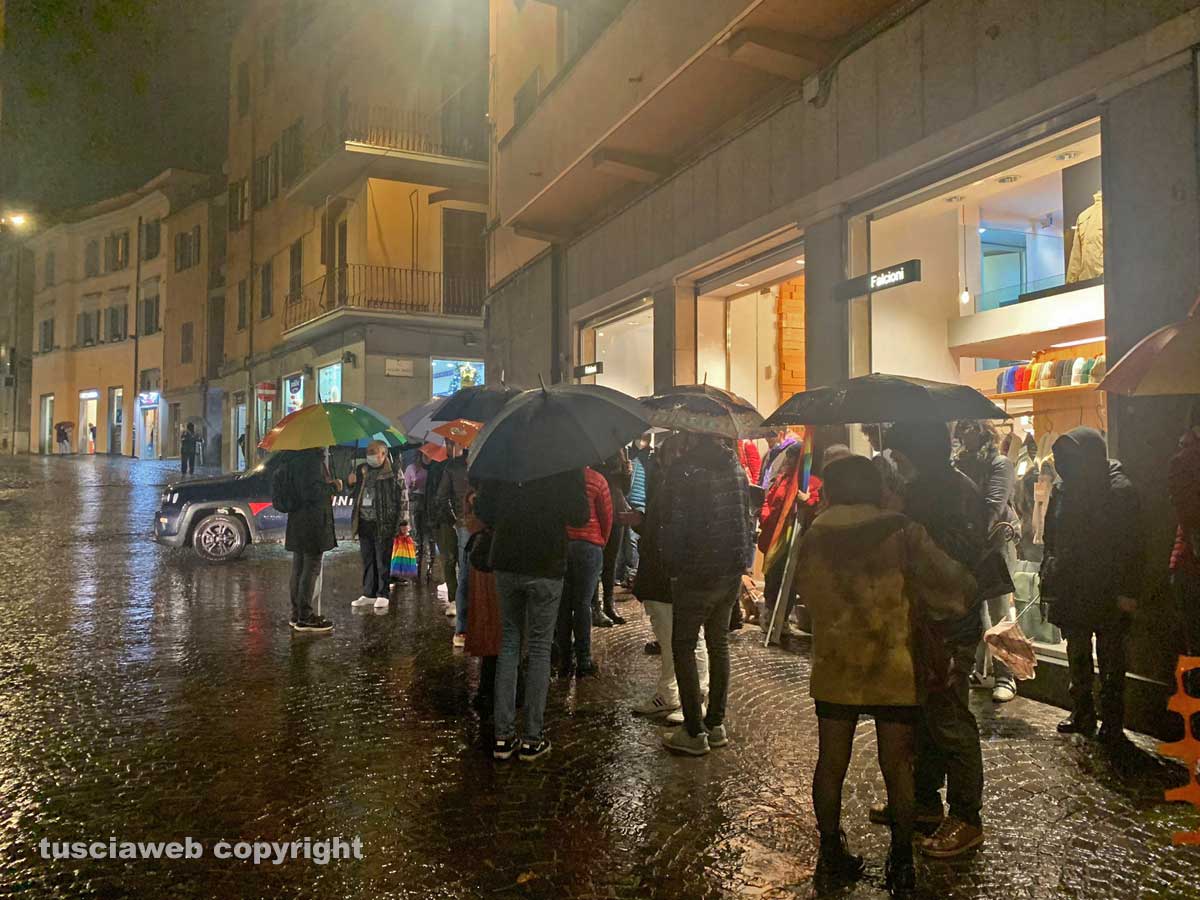 La manifestazione è promossa da L’altro circolo e Unipride Viterbo. In un sabato pomeriggio decisamente piovoso si sono aperti soltanto gli ombrelli, le bandiere sono rimaste sotto il braccio e i cartelloni arrotolati tra le mani.