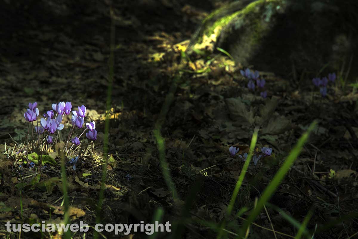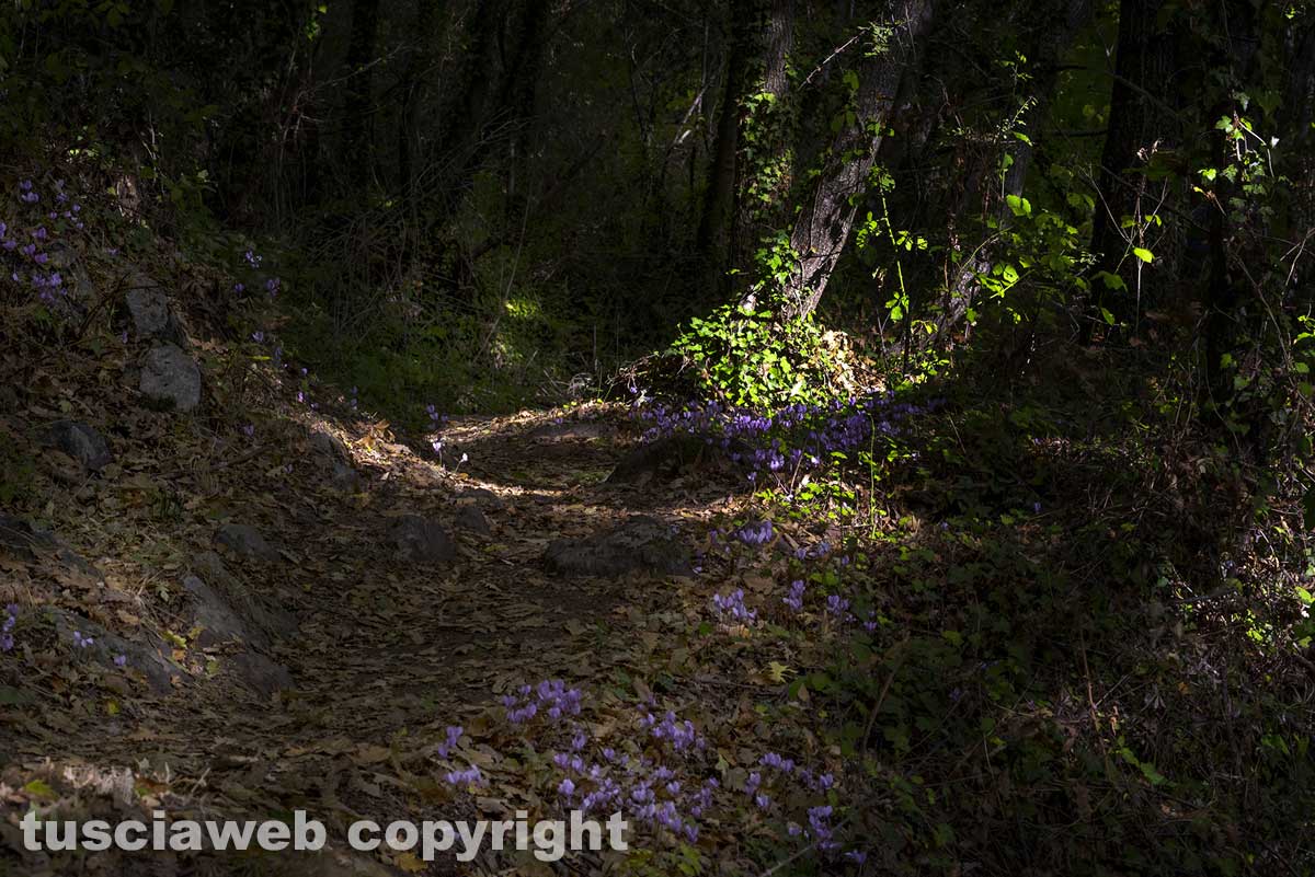 Più continuo a camminare sul sentiero del bosco di Soana (questo il suo nome) e più sento sorgere in me una piacevole tranquillità. Questo luogo dona pace e benessere, si ritrova se stessi e la serenità mentale che la vita quotidiana ci toglie. Il sentiero è immerso nella natura più pura, un saliscendi tra massi di basaltina, a testimonianza di antichissime eruzioni vulcaniche, e un’infinità di ciclamini viola che danno un tocco di colore inaspettato tra il grigio della pietra ed il giallo delle foglie cadute.