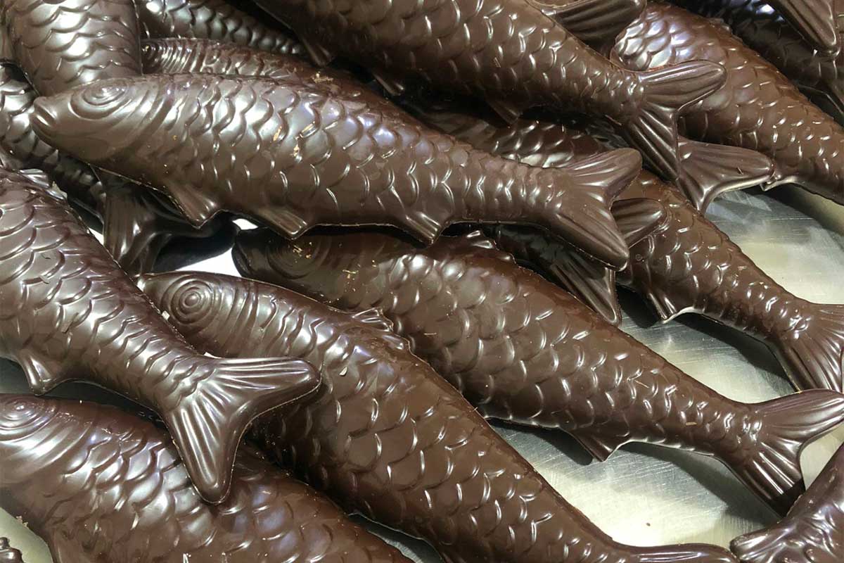 Alla vigilia della festa, le vetrine delle pasticcerie sono coloratissime, con i pesci di cioccolata al latte, bianca e fondente di ogni forma e dimensione, confezionati nella classica carta stagnola, dal rosso al verde, dal fucsia all’azzurro, oppure di marzapane: a Viterbo gli artigiani della Pasticceria Alba dei fratelli Fiorentini, della Pasticceria Primavera di Alvaro Gobattoni e della Pasticceria Garibaldi di Moreno e Marco Pierini sono maestri nell’arte del cioccolato. Si producono pesci anche a Canino, tra gli altri da Mar.Pan. Mentre Fabio Capponi della nota Cioccolateria Santori di Castiglione in Teverina garantisce la fornitura ad attività artigiane e commerciali di molti centri della Tuscia.