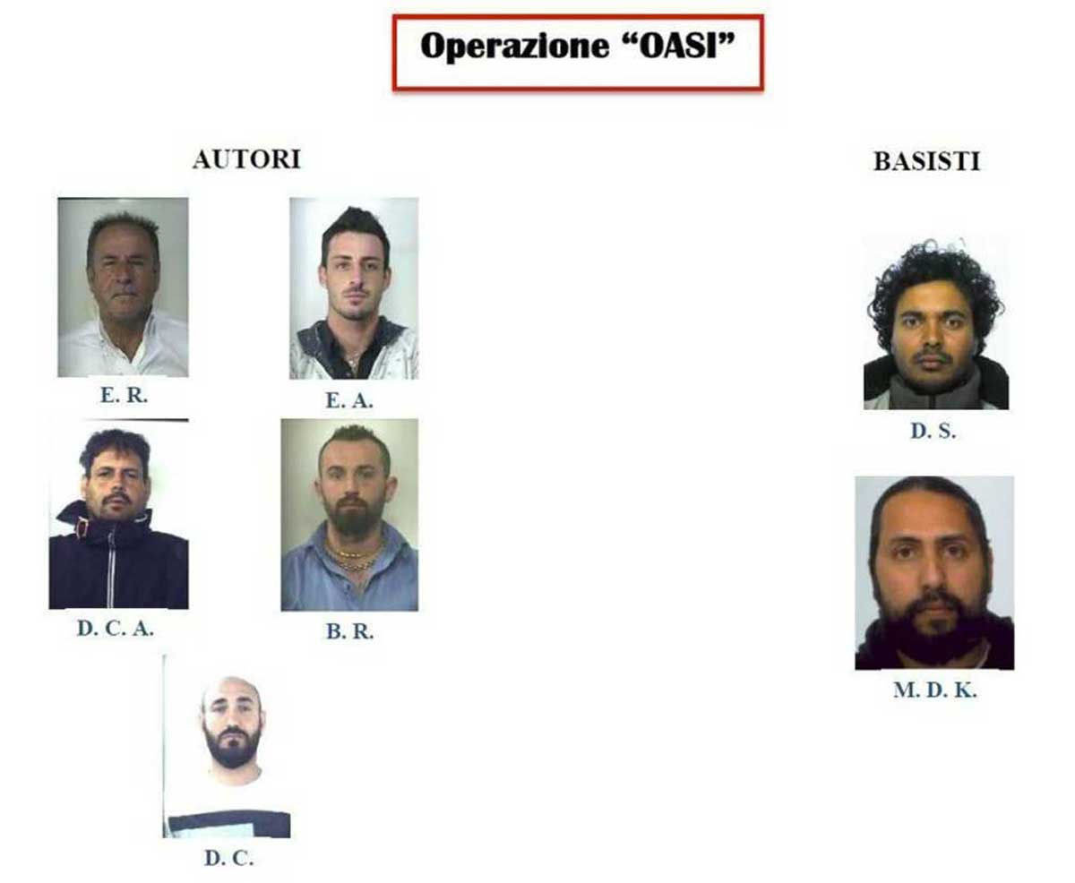 In manette sono finiti Dinusha Kasun Mihindukulasuriya, 33 anni dello Sri Lanka, residente a Ostia; Romolo Esposito, 69 anni, residente a Vetralla; Argentino Esposito, 35 anni, residente a Vetralla; Angelo De Colombi, 38 anni, residente a Fiumicino; Redzep Bajrami, 33 anni, originario della Macedonia, residente a Montefiascone; Cemp Debarre, 36 anni, di Bologna. Sia Romolo Esposito che Debarre hanno avuto precedenti per rapine e furti, anche in associazione con altri sodali.