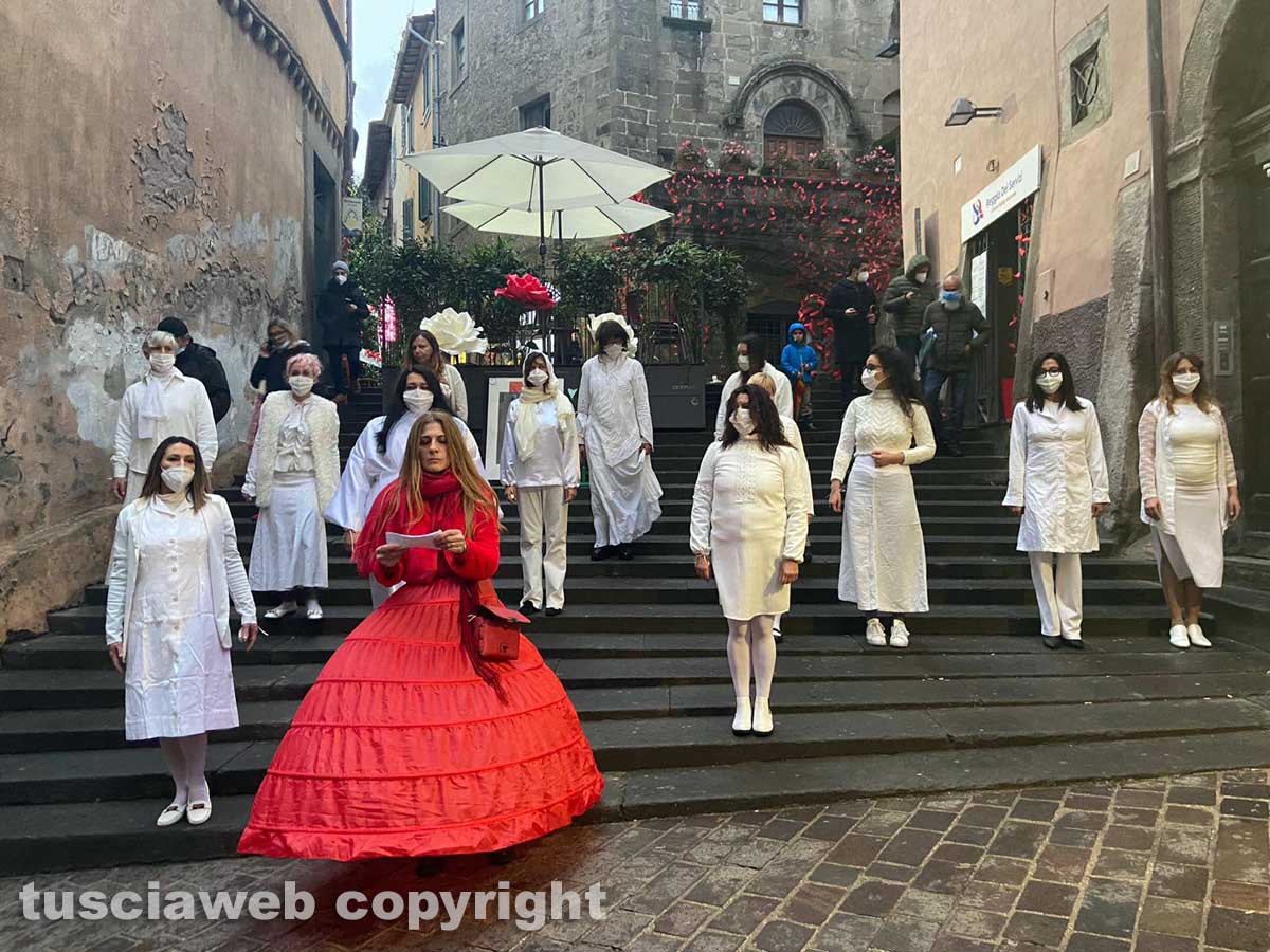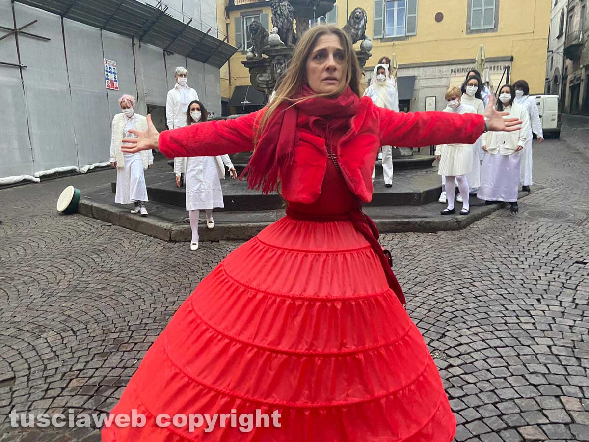 Viterbo – “Siamo noi, le soltanto vive”. Le donne che nel mondo subiscono violenza. 109 i femminicidi finora è soltanto nel 2021, una donna ogni tre giorni. Giornata internazionale contro la violenza sulle donne, Yarn Bombing e Click! in piazza per un flash mob, una performance artistica che ha coinvolto un pezzo di centro storico a est di Viterbo. Via Cavour, con partenza dal Bistrot del teatro, piazza del Comune, via Roma, via Saffi e la scalinata davanti a casa Poscia. L’iniziativa e stata patrocinata dal comune di Viterbo.