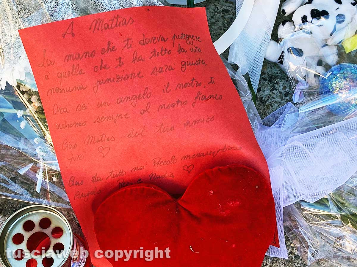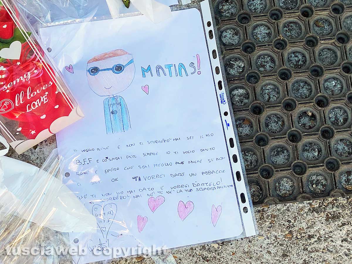 Per l’omicidio volontario di Matias è stato arrestato il padre: Mirko Tomkow, ancora ristretto e ricoverato nel reparto di medicina protetta di Belcolle in attesa di essere trasferito in carcere come disposto dal gip all’esito dell’interrogatorio di garanzia. “La mano che ti doveva proteggere è quella che ti ha tolto la vita – gli ha scritto su un cartoncino rosso l’amico Yuri -. Nessuna punizione sarà giusta. Ora sei un angelo, il nostro. Ti avremo sempre al nostro fianco. Ciao Matias, dal tuo amico Yuri”.